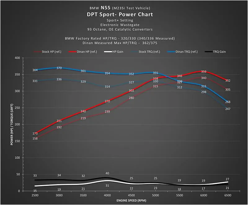 DINANTRONICS Sport Maximum Gains (N55): Up to 30 HP, 40 lb-ft of torque.