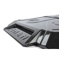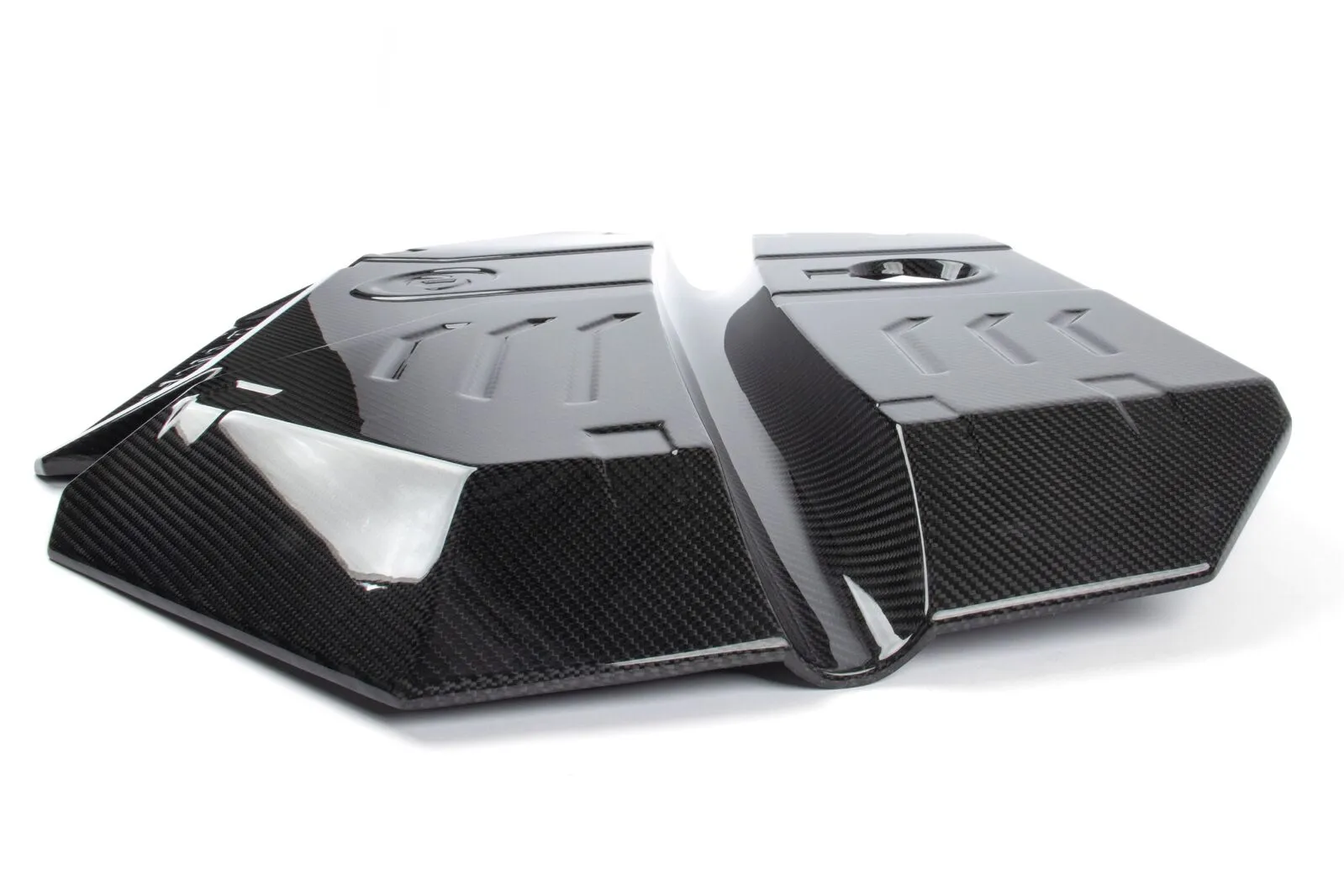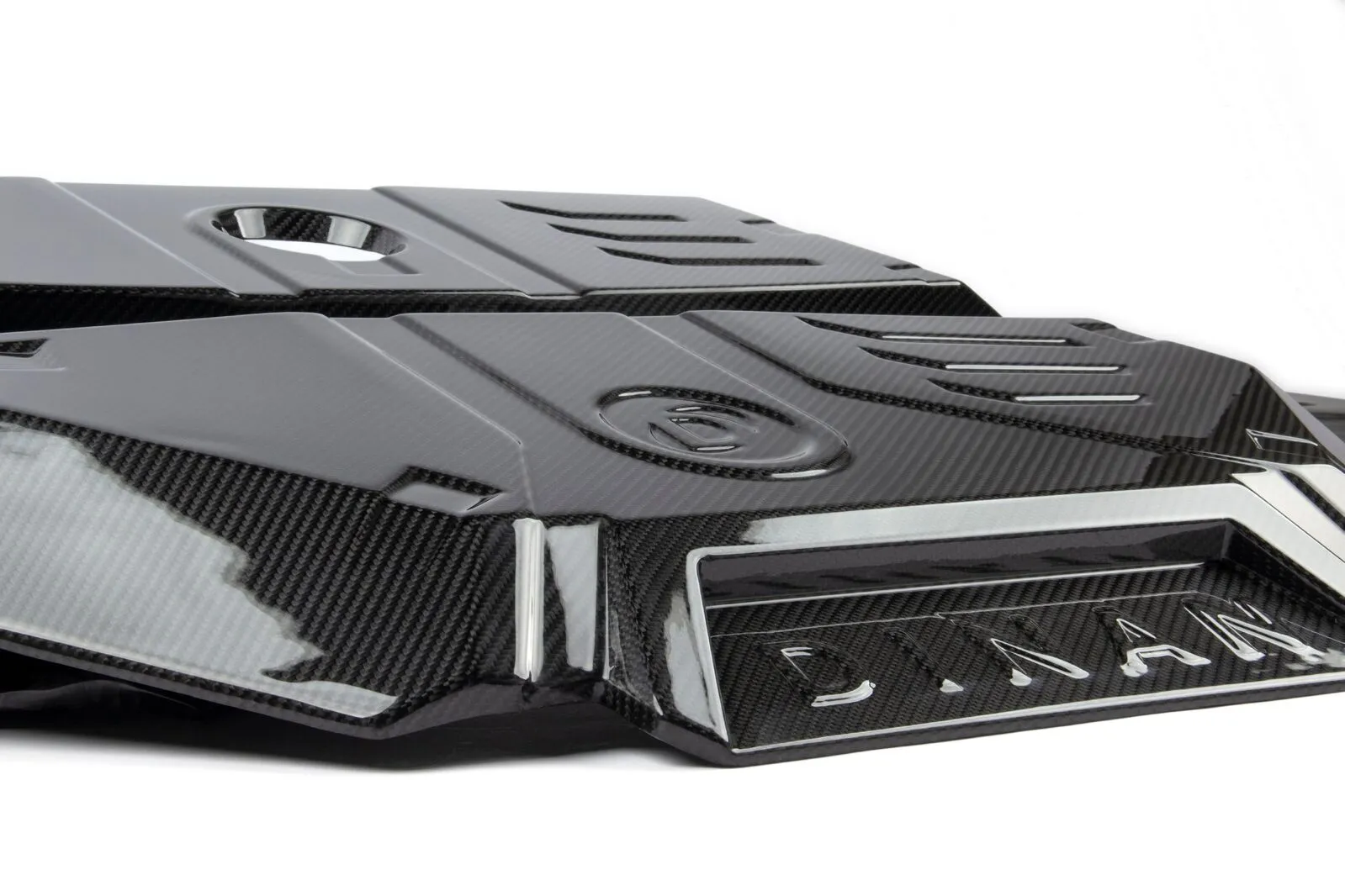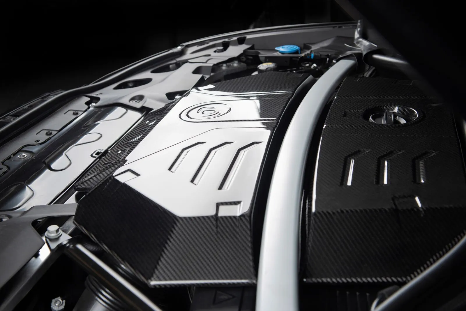 The massive, detail laden, UV coated 2x2 carbon fiber lid inhabits the same footprint as its factory counterpart but flairs outward at its sides in order to inhibit the view of some of the unsightly stainless-steel hardware underneath that is visible in stock form. With the goal of having the engine bay as clutter free as possible the engine cover itself is also devoid of distracting mounting hardware. Instead, powerful rare earth magnets are utilized resulting in not only an incredibly clean installation, but also one that takes no time or effort to mount. As a bonus, already straightforward filter changes are made even easier and expeditiously.