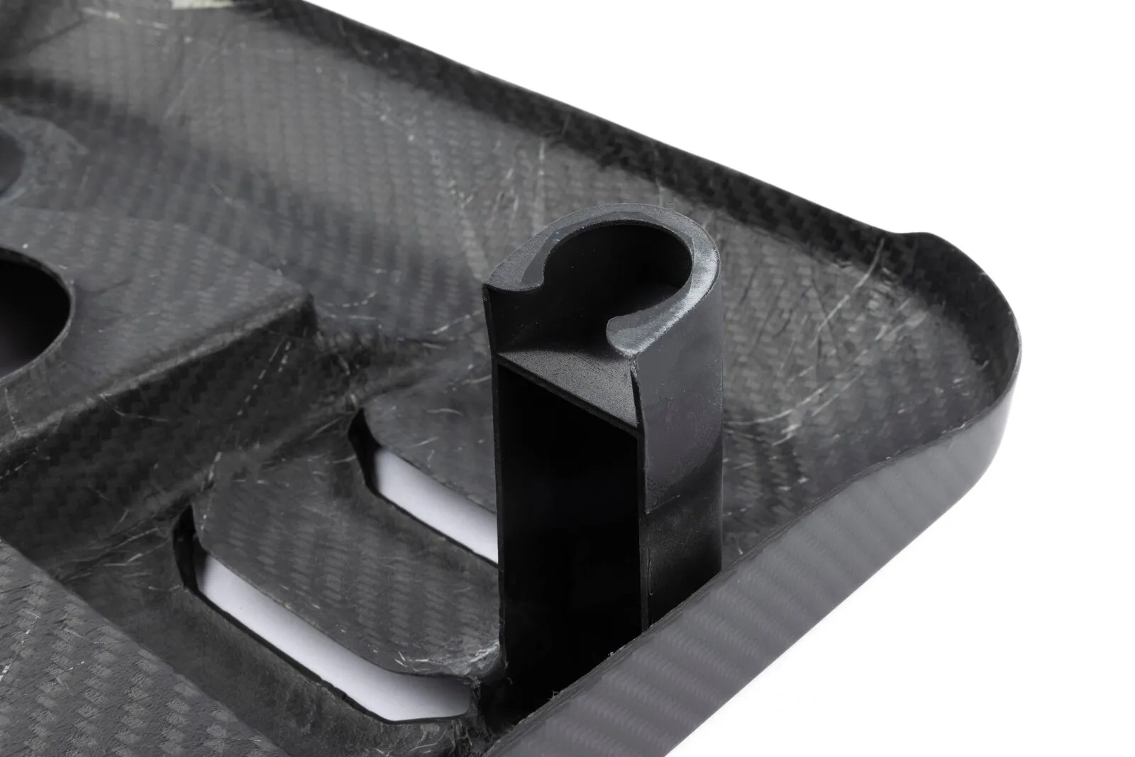 The visually uneven engine bay of the G8x M2/M3/M4 has been a perceived blemish Dinan has aimed to correct since delivery of our first G82 M4. At its most basic level, extending the engine cover across the charge cooler allows a more uniform and symmetrical look and provides a more complete aesthetic. Beyond the overall footprint however is a piece loaded with intriguing details. While many elements of the factory engine cover, such as the power hump, are re-used, there are numerous other features that have been enhanced or changed altogether with the Dinan offering. From vertical orientation of the cylinder count callouts to the use of opposing finishes for additional visual intrigue, the Dinan S58 engine cover stands alone in its uniqueness.