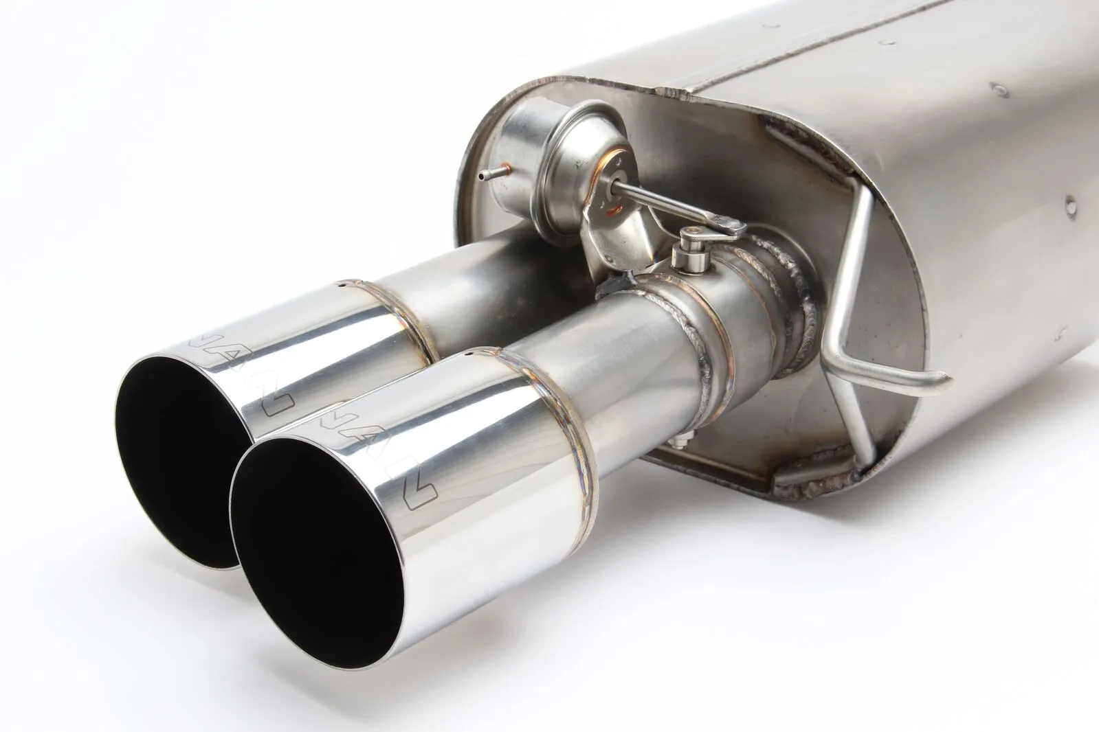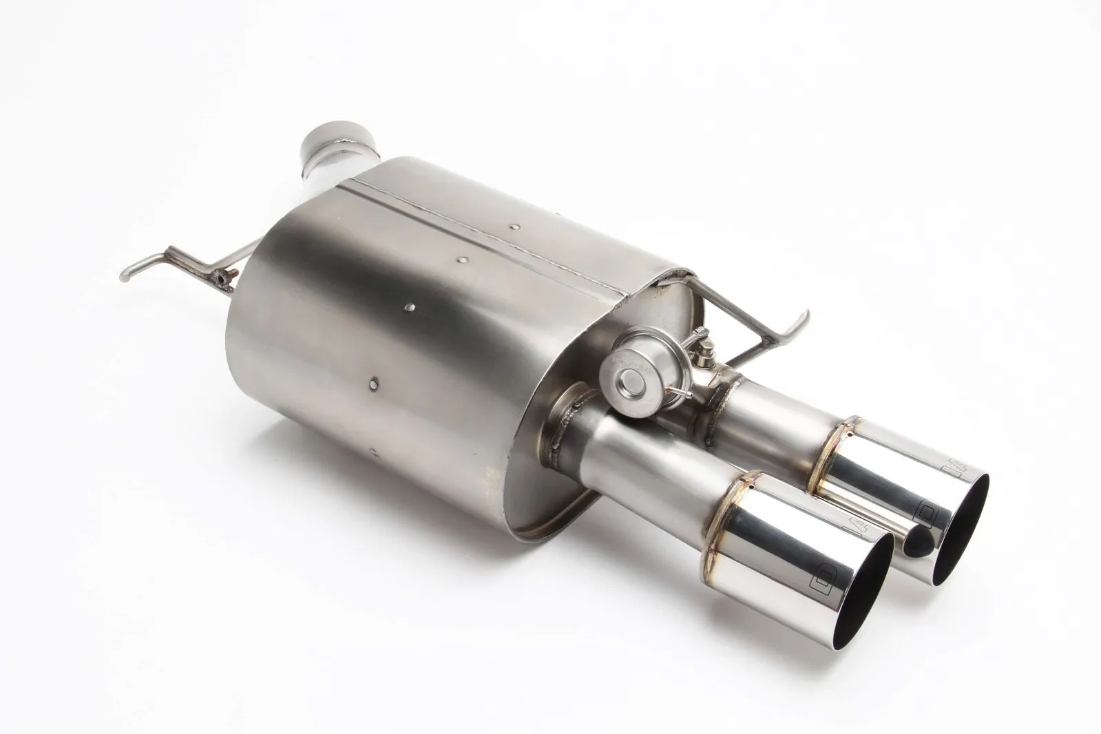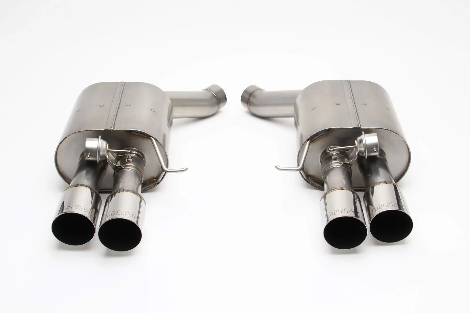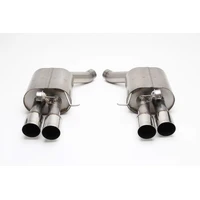 Dinan's Free Flow Axle-Back exhaust system features 100% stainless steel construction measured to exact specifications to ensure proper fit via factory hangers and mounting points. Dyno tuned for maximum exhaust flow with minimum backpressure, this system is designed to provide a more aggressive sound under acceleration while reducing drone inside the vehicle, thanks to Dinan's exclusive Helmholtz Chamber and Butterfly Valve technologies. The exhaust gasses exit through larger laser engraved ultra durable polished, or ceramic black, quad tips.