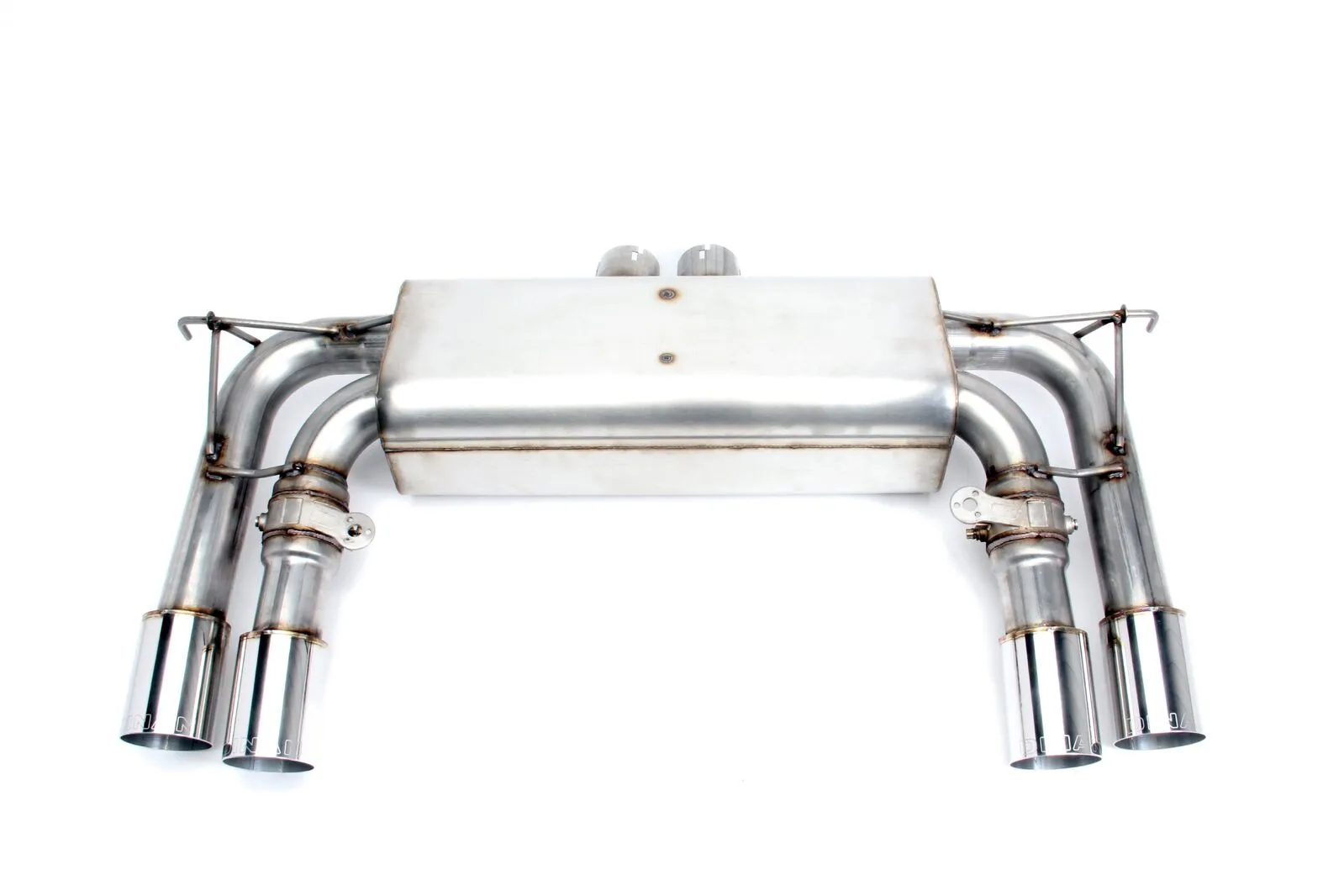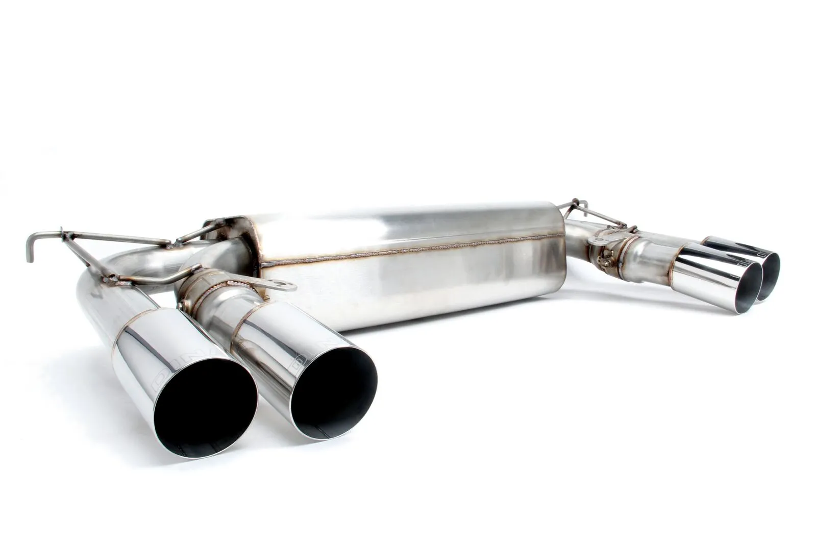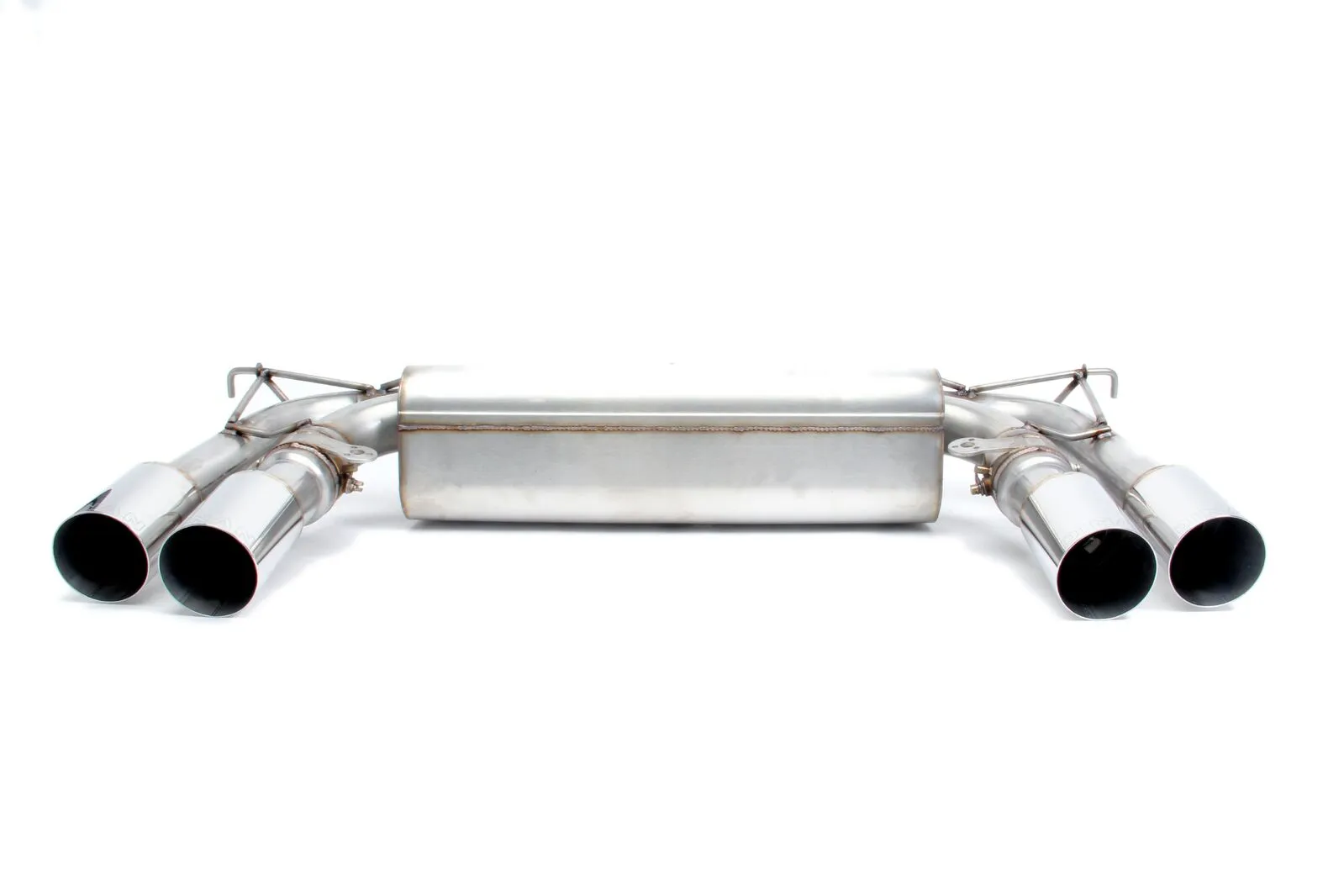 The exhaust system was designed to improve exhaust flow by reducing back pressure, resulting in increased power output and a deep sound that is civilized when you want it to be, and pleasantly aggressive under hard acceleration. Dinan also incorporates a Helmholtz chamber design that reduces resonance or"drone" at low RPM. The technology within the can is matched in impressiveness by its outward appearance and design as the system is built to exacting specifications to ensure a simplistic bolt-on installation. It is made from 100% 16 gauge 304 stainless steel and will resist corrosion for years to come. The design features quad 89mm (3.5") black ceramic or polished exhaust tips for a tasteful high-performance look.