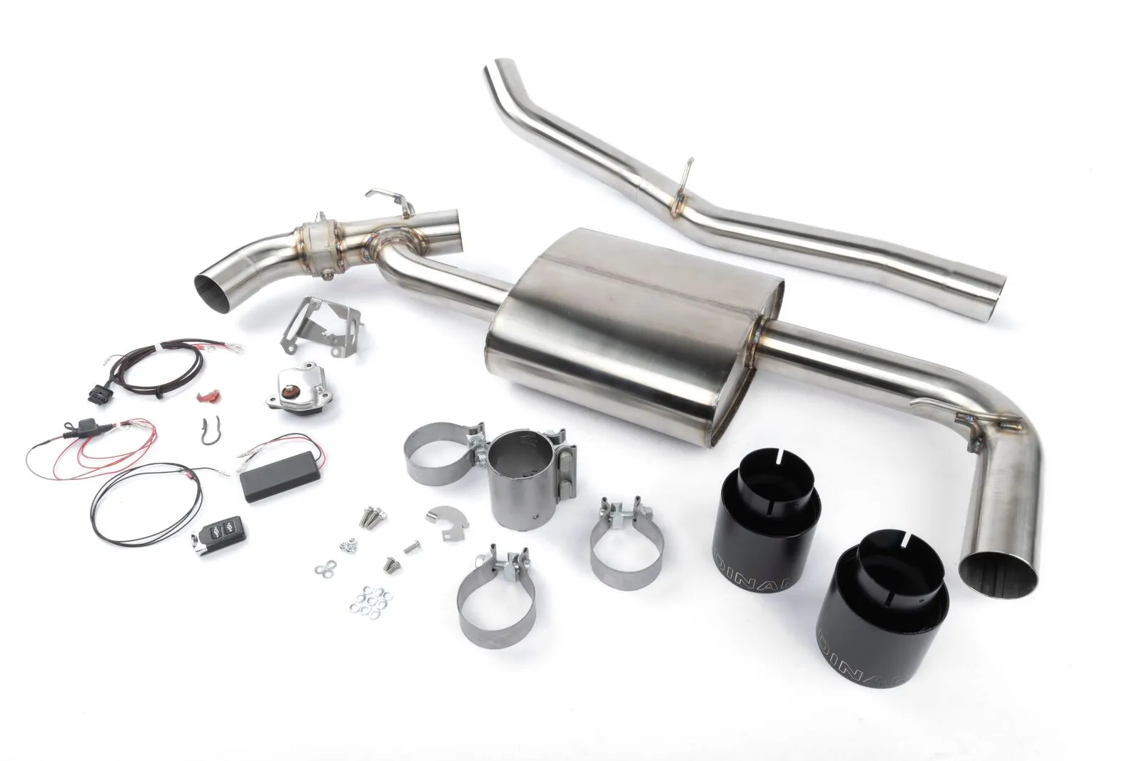 While sound is the primary reason for any exhaust purchase the styling and craftsmanship also play an important role for the discerning buyer. The Dinan F60/F54 S ALL4 exhaust has been skillfully crafted entirely out of T304 stainless steel and TIG welded for the best visual appearance and color. The entire system is then brush-finished to further guarantee an immaculate looking system out of the box. The attention to detail is not limited to parts of the system you can't see once the exhaust is installed but is also extended to the exhaust tips themselves. The Dinan exhaust sports enormous, dual 4" (102mm) clamp-on, double-walled, black ceramic coated and laser engraved exhaust tips. Dinan has retained its signature straight cut tip design, safeguarding its unique and elegant styling position, amongst a marketplace dominated by angle cuts. The tips masterfully fill up and accentuate upon the factory cut-outs showcasing an extremely aggressive, yet refined, styling that will turn heads even before it is heard.