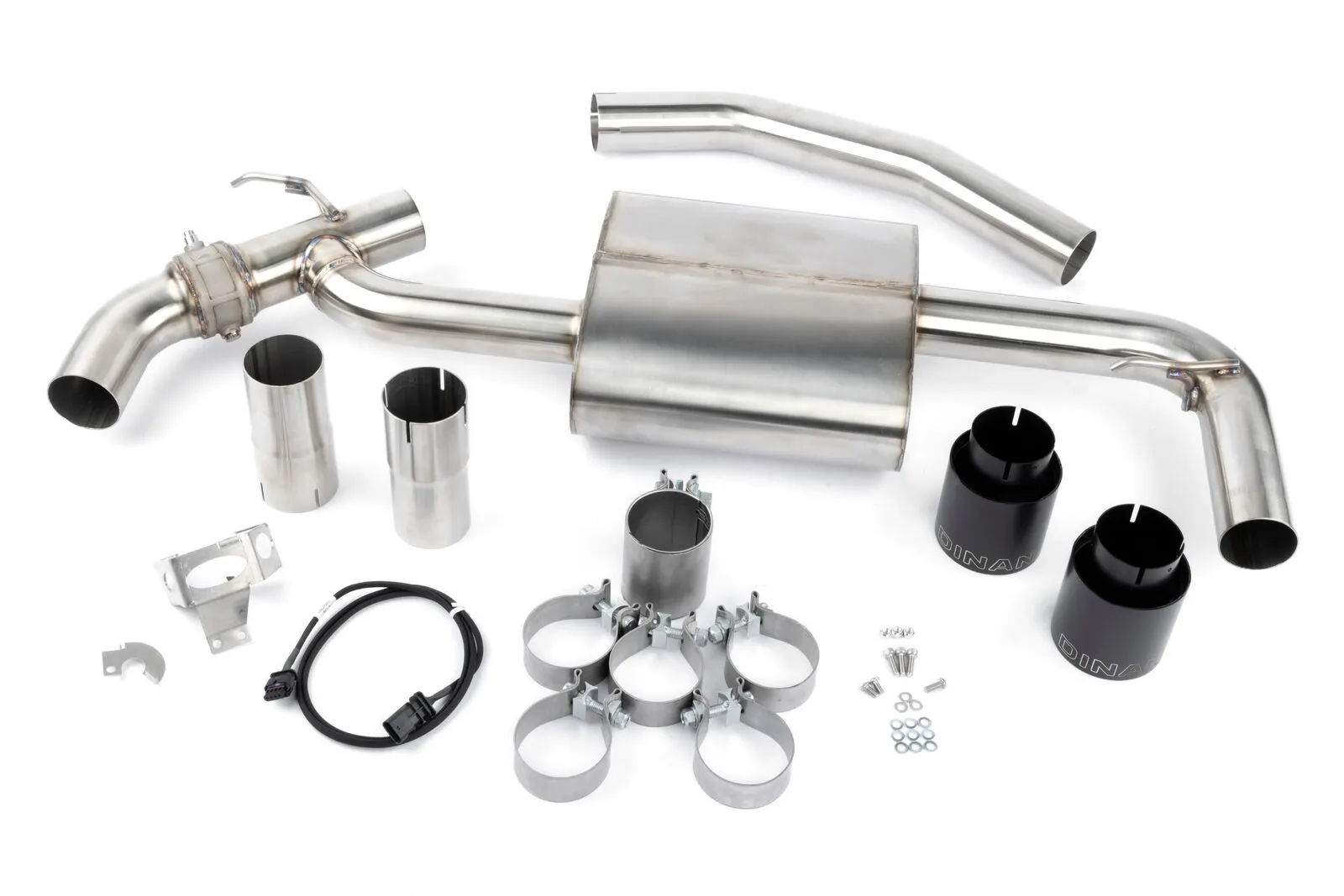 The Dinan exhaust system offers a dramatically improved exhaust note that is not only louder but fuller and deeper as well. 70mm piping, free of hydroforming, is used throughout that allows freer flow to traverse the entirety of the system. The tubing is then fed into a streamlined muffler that is typical of all Dinan exhaust design and utilizes absorption technologies designed to improve exhaust flow and reduce back pressure. The combination results in mildly improved power output at the extreme top end of the power band and a great sporty sound complete with pops for additional aural gratification. Factory valve control is also retained to ensure the perfect blend of civility when not pushing the car and a bit of additional character when in it. Regardless of driving style or conditions the system is purposefully engineered to reduce low-RPM drone, so the cabin of the vehicle remains intimate and not drowned in an excessively loud tone.