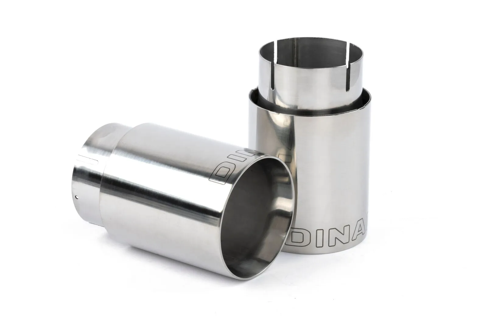 • Dual 4" (102mm) double-walled, polished clamp-on tips with laser engraved Dinan logo