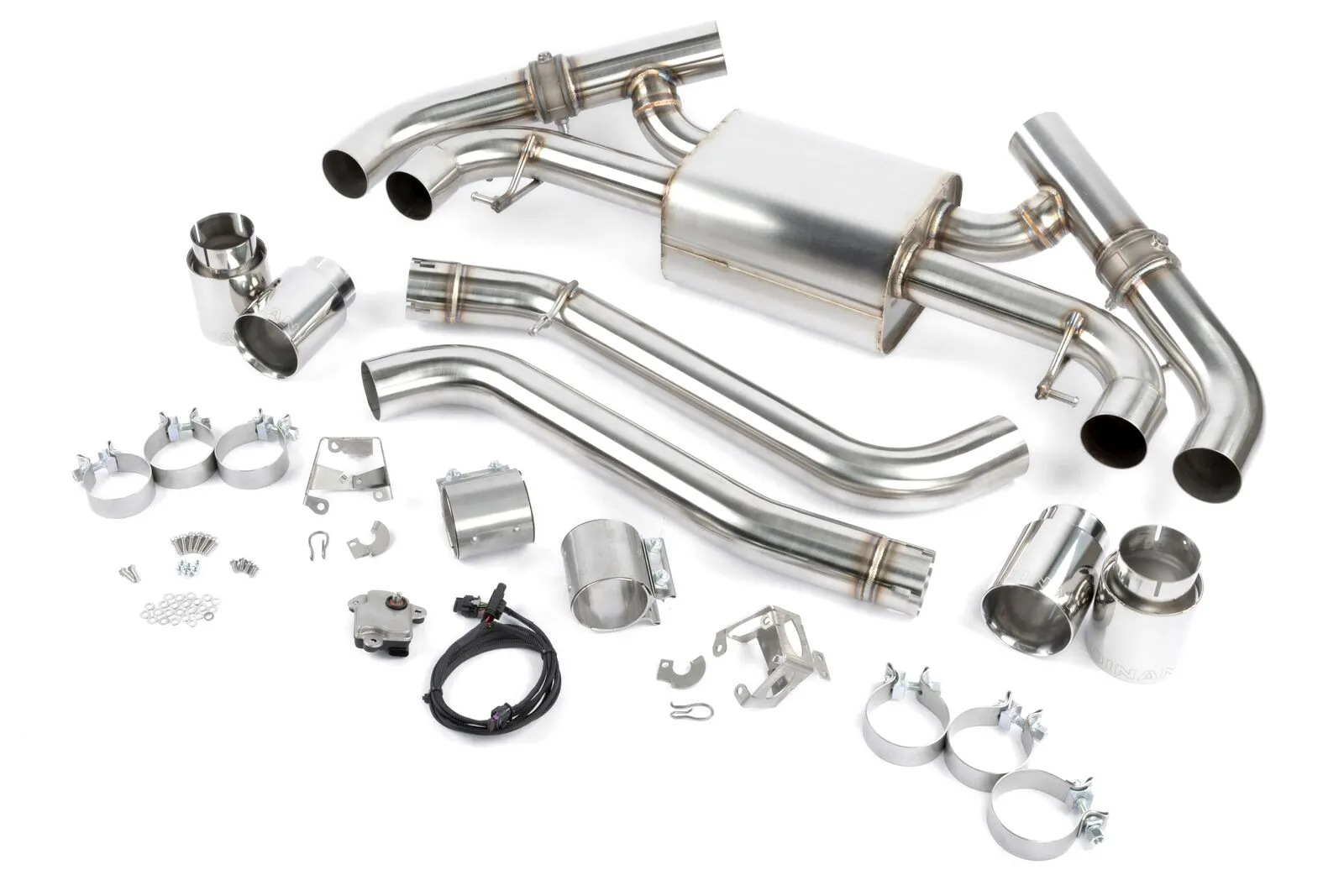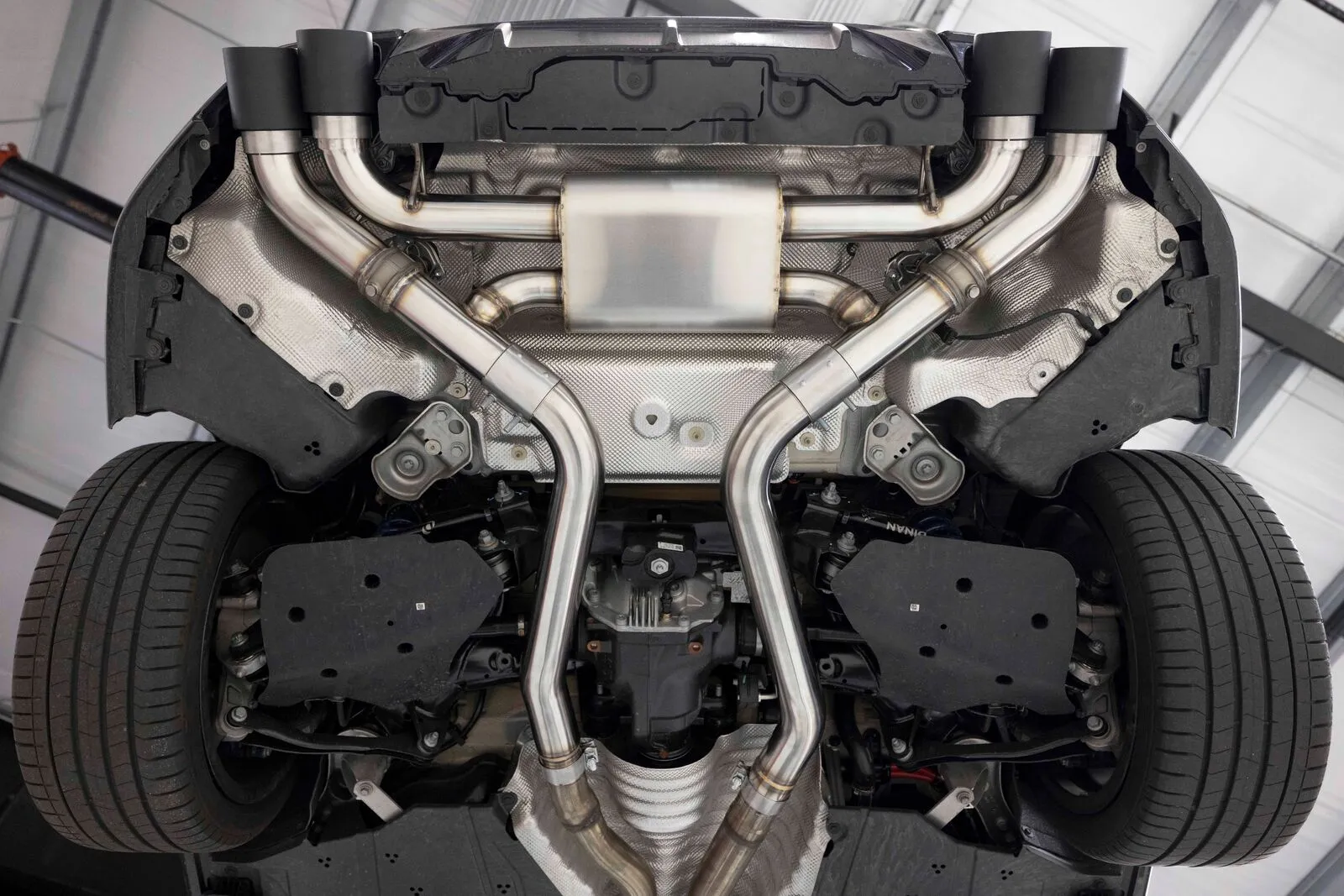 The use of quad tips also presented some additional challenges and fostered some innovation to the already visually impressive system constructed entirely of TIG welded and brushed T304 stainless steel. Confined to dual tips, the factory system utilizes only one exhaust valve and functions by eliminating the passenger side tip when the valve is closed, siphoning all gases through the muffler and out the driver's side tip for quieter operation. With the introduction of more pipes/tips, this methodology was not practical, or desired. In true Dinan M exhaust fashion, our talented engineering team decided that integrating a second valve to the system would garner the most favorable results in both symmetry and overall sound. The result is a system that incorporates larger 76mm tubing (vs 70mm stock) and allows freer flow through the entirety of the system but specifically to both outer pipes when the enlarged valves are open. The resulting flow and sound mimics an awe-inspiring straight pipe solution with a deeper and meatier tone, a defining element of all Dinan exhausts. In contradiction to the aggressiveness resulting from open valves, when the valves are closed, all gases are forced into the muffler for sound deadening and exit the two inner tips. Regardless of valve position, the intimate nature of the interior is retained so conversation can continue without an excessively loud drone courtesy of numerous drone abatement technologies in the can. With the Dinan exhaust equipped on the M240i you get the best of both worlds; aggressive tone/sound and civility. A combination that is paramount to any M exhaust, and now by virtue of tip count, the M240i as well. Welcome to the illustrious family.