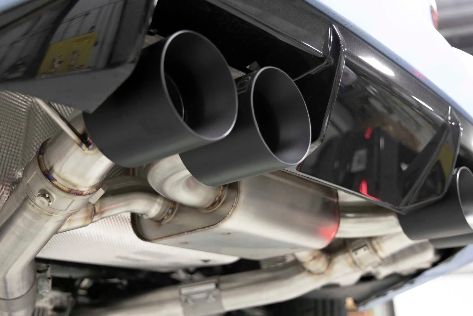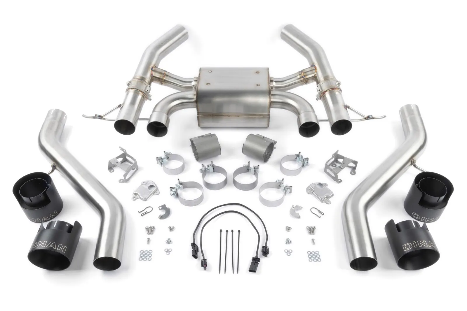 Visually, the Dinan G87 M2 exhaust has been skillfully crafted entirely out of T304 stainless steel and TIG welded for the best visual appearance and color. The entire system is then brush finished to further guarantee an immaculate looking system out of the box. The attention to detail is not limited to parts of the system you can't see once the exhaust is installed but is also extended to the exhaust tips themselves. The Dinan exhaust includes massive, quad 4.5-inch (114mm) clamp-on, double-walled, black ceramic coated and laser engraved exhaust tips. Despite the seemingly cartoonish size on paper, the tips mesh seamlessly and fill the factory cut-outs to complete the OEM+ look with a healthy dose of audible attitude.