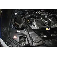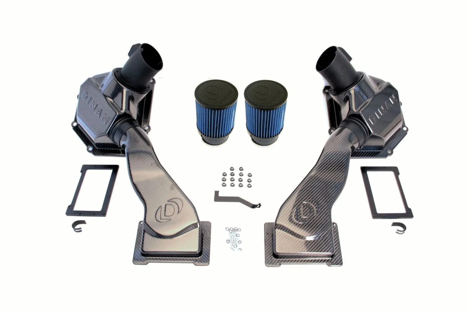 The F10 M5 Dinan high flow carbon fiber cold air intake, like most Dinan products, has a sleek and functional appearance that embodies high performance. The F10 M5 cold air intake allows cool outside air to be pushed into the engine via a pair of supplemental carbon fiber intake ducts located at the front of the engine bay. The M5 cold air intake system was carefully designed within tight packaging constraints and in consideration of ideal aerodynamic diffusing angles to optimize the efficiency and performance of this induction system. Each duct leads combustion air through a custom-designed intake assembly that has a larger than stock metered air flow housing as well as a Dinan conical air filter with a 77% larger capacity. Dinan engineers have painstakingly developed custom tooling to ensure the entire Dinan cold air intake system is sealed like a factory replacement, thereby preventing hot air from the engine compartment to compromise its effectiveness. The stock air inlets are left intact and fully functional to provide a new total of four air intakes into the engine for maximum airflow. Improved induction airflow offered by Dinan cold air intake systems increases engine performance, even more so if used in combination with other performance-enhancing Dinan products.