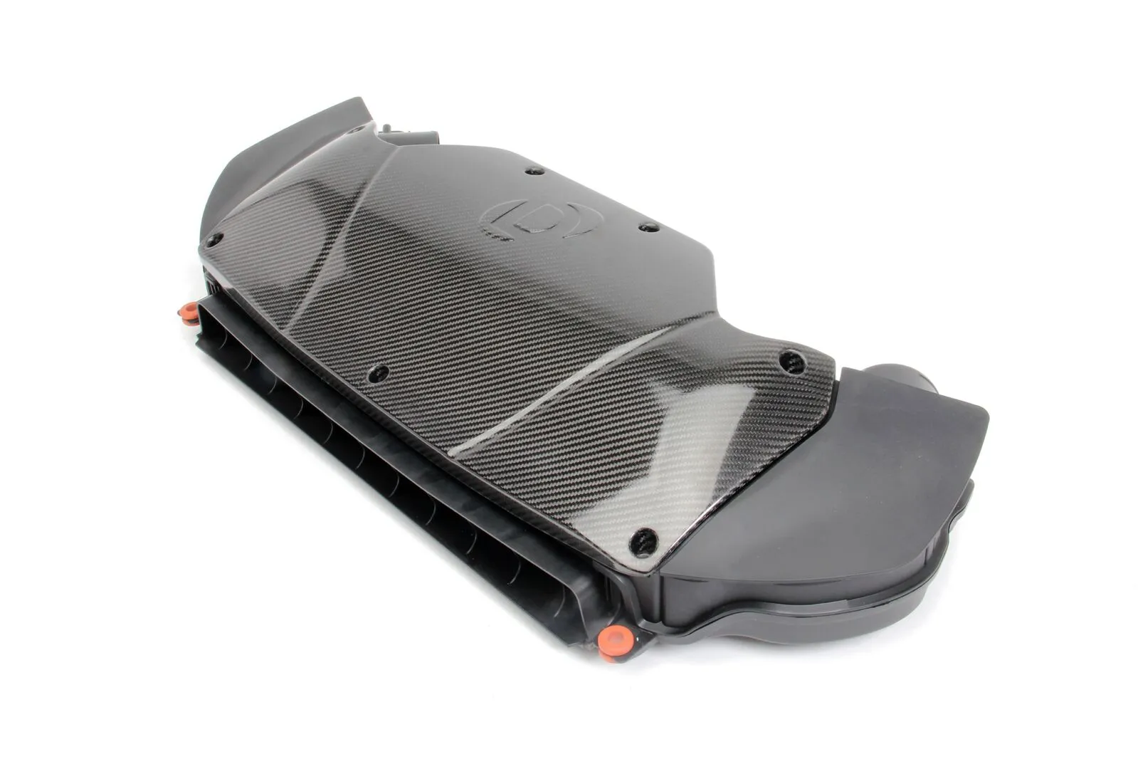 NOTE: Lower box pictured is not included in the kit and is used in photography for illustration purposes. Stock lower box is re-used. The intake kit consists of a carbon fiber lid and two custom filters. Filters do not fit the stock cover and would require the re-worked Dinan lid.