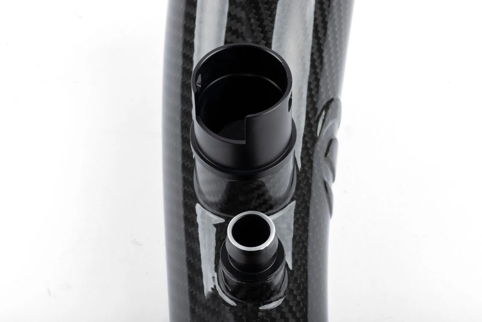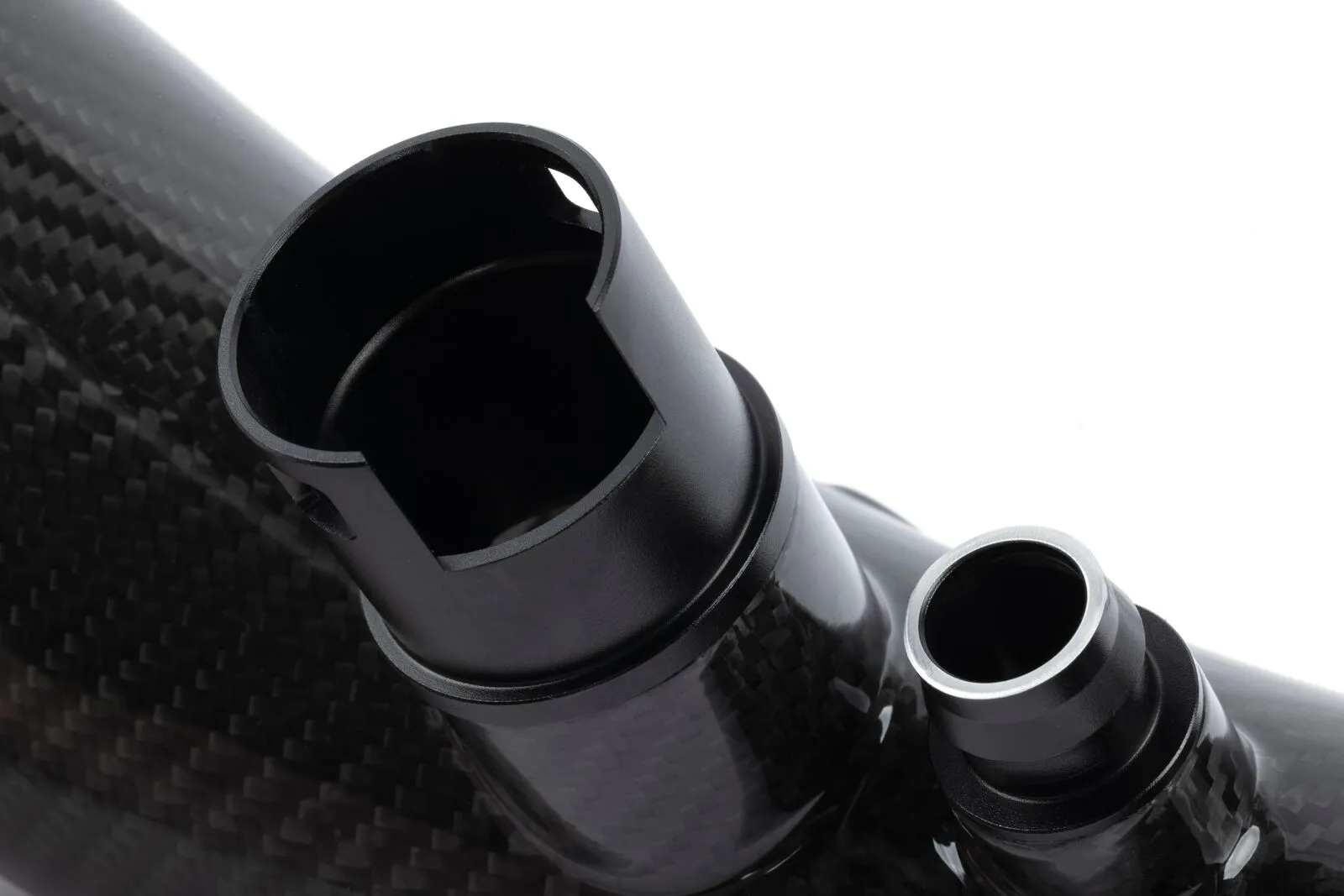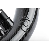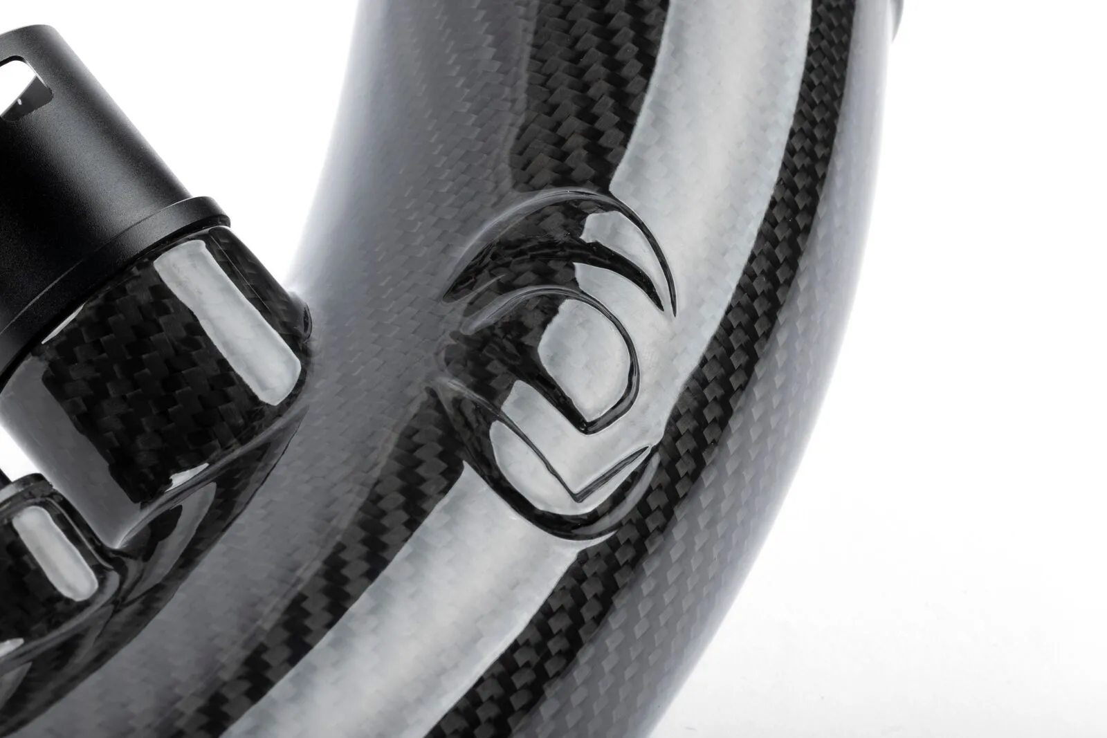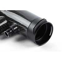 Regardless of application, a Dinan turbo inlet replaces the weak, and failure prone, plastic factory inlet with a more robust carbon fiber one. CNC machined fittings are utilized to ensure proper fitment and guarantee installation as a direct replacement to the OEM inlet. Beyond material and fitment however are the improvements to the characteristics of the primary element in the system, the pipe itself. The stock turbo inlet has incorporated additional features (multiple in some cases) that introduce flow restrictions and turbulence while also reducing turbo noises. All of which are unwanted but easily rectified by removing the various resonators and enlarging (and optimizing) the path for a more uniform flow. The result is an inlet that delivers not only more air and allows the turbo to be more efficient (work less) but also provides the oft desired amplification to the turbo induction soundtrack.