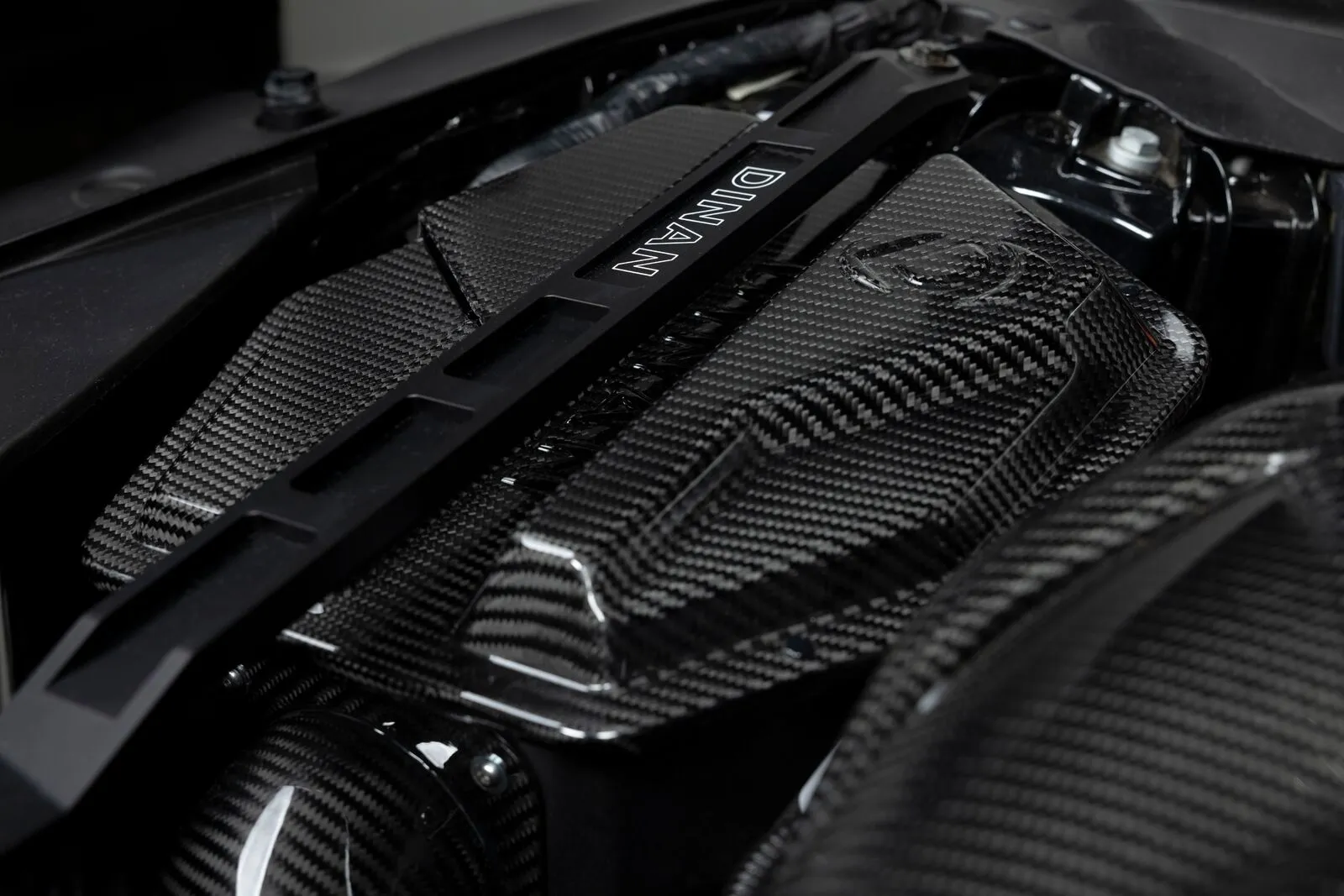 With more air being pulled into the system, throttle response is improved, and additional power is realized in the form of max gains of +13 WHP / +14 lb-ft of torque on an otherwise completely stock vehicle. Beyond stock or basic bolt-on equipped vehicles, the Dinan intake would expand the potential of the platform's power ceiling. Put simply, those striving to build a more potent and robust solution, complete with turbo and fueling upgrades, will be allowed to maximize the results without worry of the intake system being a limiting factor. Regardless of the level of the build, the secondary air inlets, as well as the sound slot present on the lid, allow the intake system to be more audible so the turbo spool and BOV can be appreciated. A stark difference from Dinan's traditional fully sealed systems where induction noise is not nearly as recognizable. Not to be outdone by the increased power and sound, the outwardly visible system is made of immaculate 2x2 gloss twill carbon fiber resulting in vastly improved under hood appeal. Joined by the aluminum Dinan strut braces and matching carbon fiber engine cover, the engine bay instantly becomes equally as showy as the exterior. A unified style, inside and out, with a bit of turbo attitude.