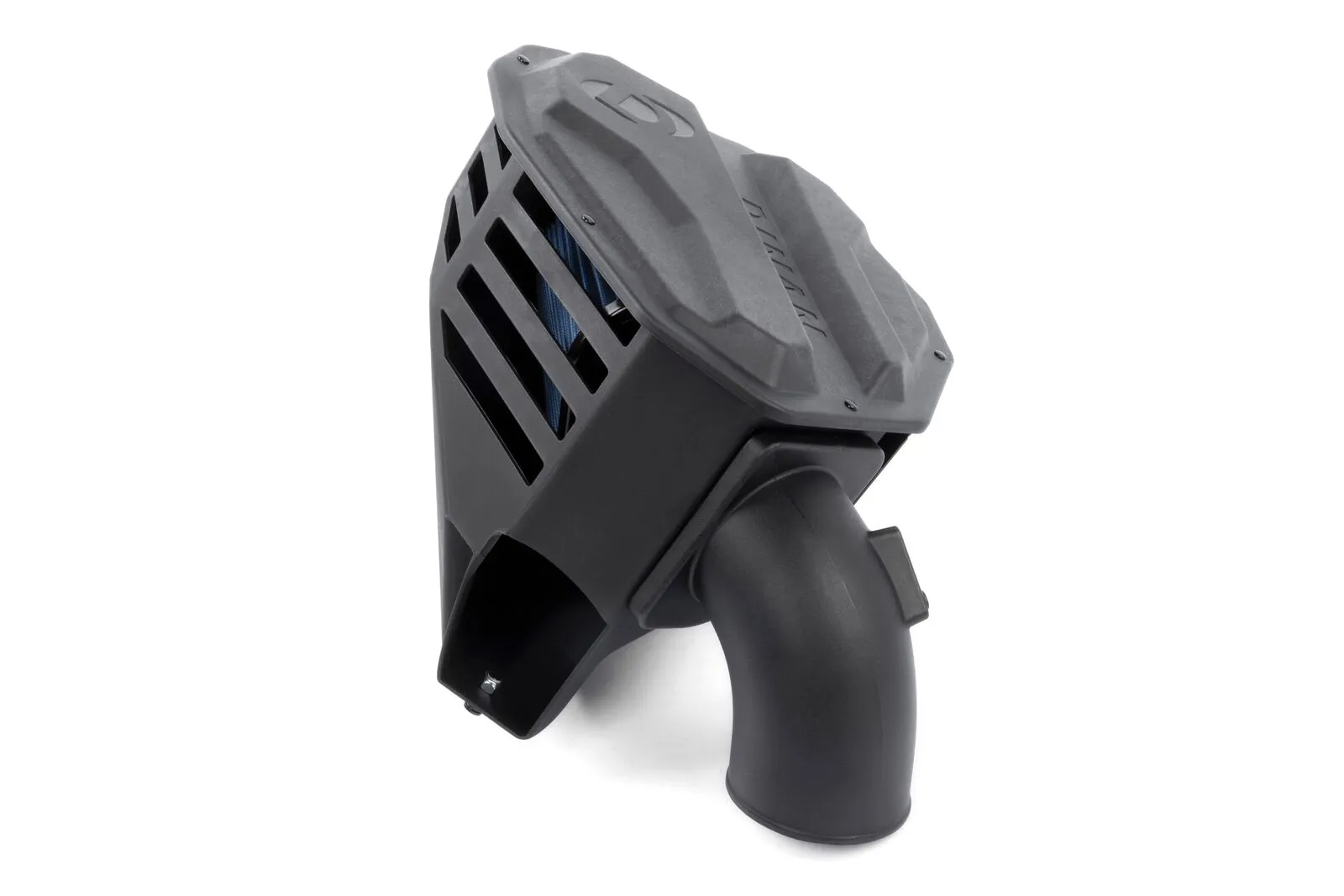 To achieve the gains in flow that set the Dinan intake system apart, the entire lower box of the system, and not just the lid, has been reworked and enlarged to make use of as much of the available real estate as possible within the engine bay. In turn, this allows a 40% larger, custom, free flowing filter to be housed within and maximum flow to be realized. However, a secondary inlet has always been desired by Dinan in order to effectively fill the volume of the enlarged air box and increased filter surface area. This desire led to a multitude of experiments being conducted on the effectiveness of a possible open-air inlet in the system. With different shapes, locations, and sizes of openings being tested, the goal was to ensure that the added secondary inlet did not cause any unwarranted side effects such as an increase in air temps in the system. This is commonplace with open-air intake systems where overheated engine bay air is employed in the intake tract. The results of these tests showed that the patterned openings present in the final iteration of the box located on the opposite side from the engine provided a perfect balance of additional volume to assist the factory inlet all the while not causing an increase in turbo inlet temperatures. This was the case regardless of testing conditions (single/multiple gear pulls, constant speed, 0-100mph runs, etc.).