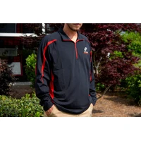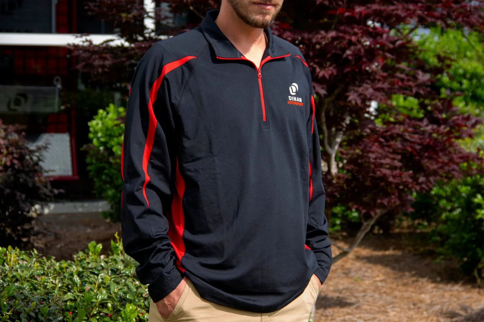 This soft-brushed pullover is stretchy and moisture-wicking with red splices and subtle texture. Not to mention the best-looking pullover available anywhere with a Dinan logo.