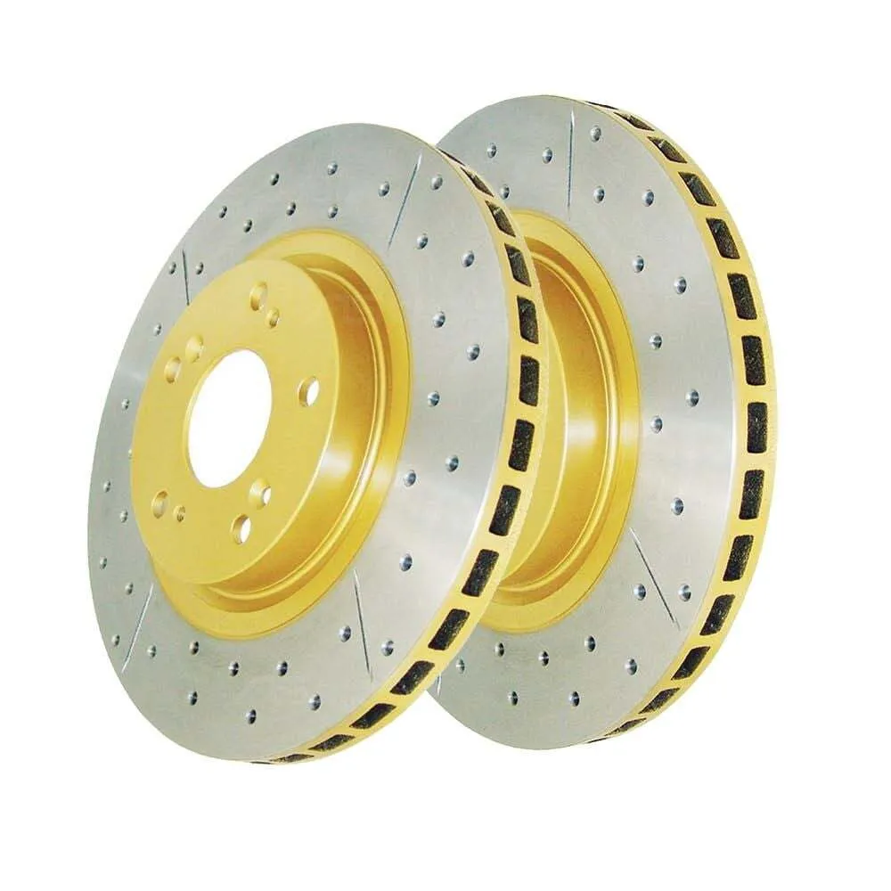 DBA rotors can be improved with the X-Gold design, a unique non-directional cross-drilled pattern that increases passive cooling, allows for gas-escape whilst maintaining excellent rigidity. The performance realised is similar to the T2 slotted range, however the aesthetics are further enhanced with all of the non-friction surfaces being coated in a unique gold paint.