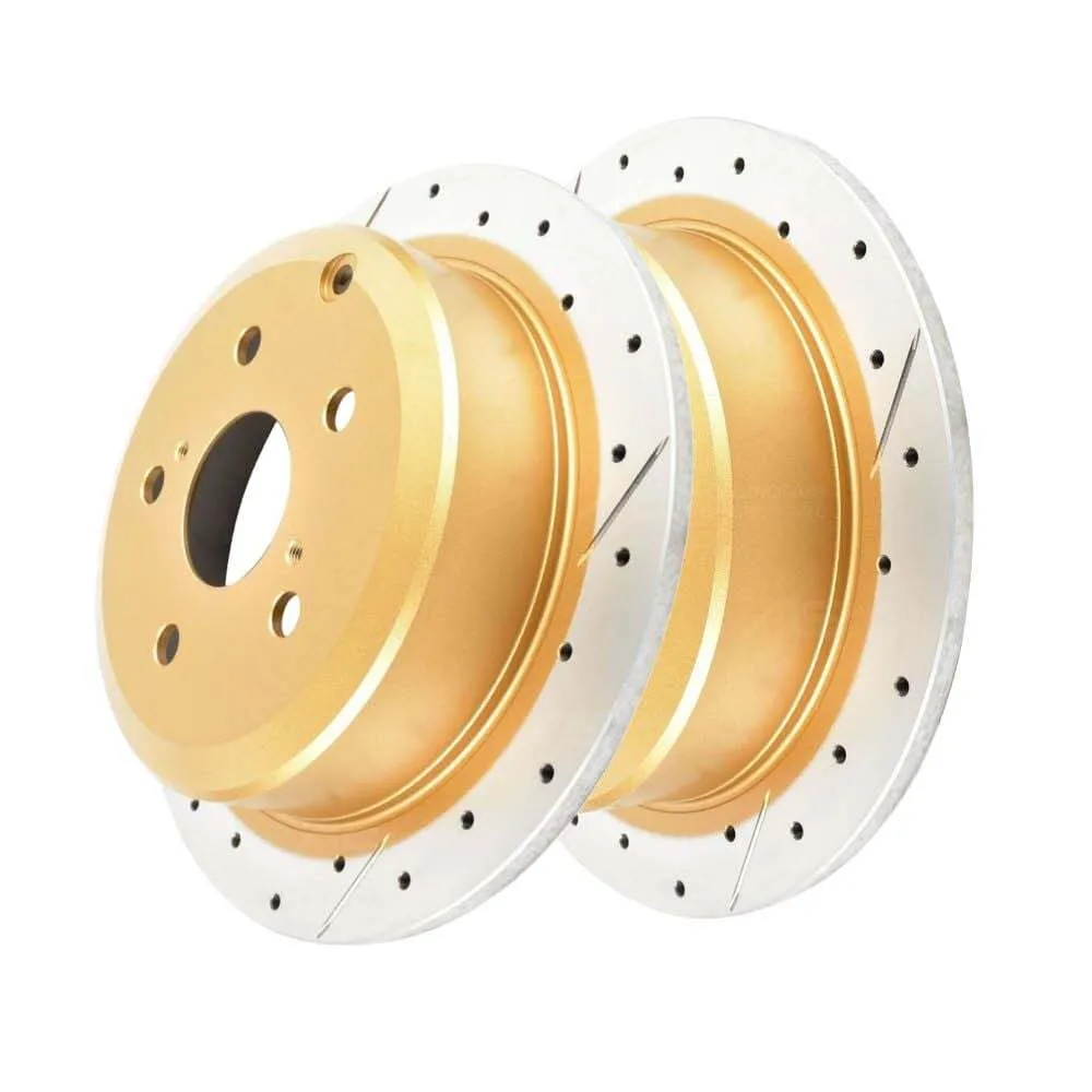 DBA rotors can be improved with the X-Gold design, a unique non-directional cross-drilled pattern that increases passive cooling, allows for gas-escape whilst maintaining excellent rigidity. The performance realised is similar to the T2 slotted range, however the aesthetics are further enhanced with all of the non-friction surfaces being coated in a unique gold paint.