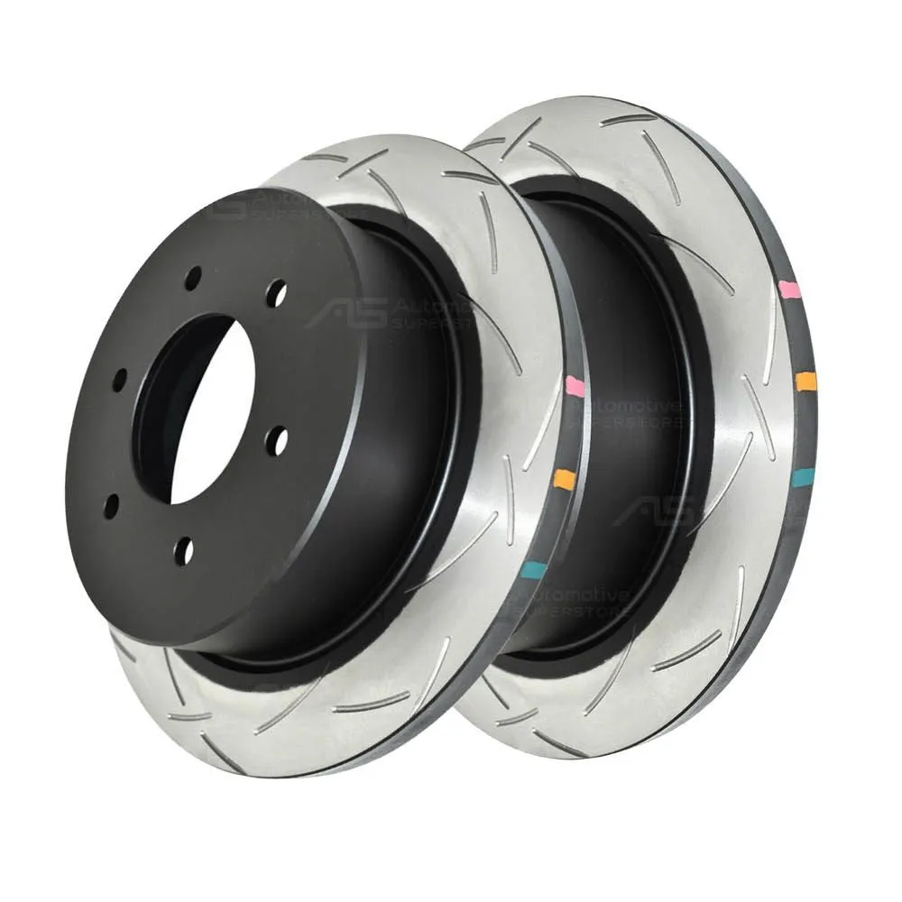 DBA's 4000 Series and 5000 Series rotors can be further enhanced with optional slots known as T3 - 48 CNC machined tri-directional curved slots. Machined slots in the friction surface allow a channel for braking by-products - brake dust and gasses from the incredible heat - to escape. This has a multitude of benefits, from reducing pad contamination, controlling heat build-up, and brake pad knock back. These combine to enhance braking performance and increase service life of the pads and rotors. Compared to more common straight slots, the unique curved slot design reduces the noise associated with 'racing' brakes, and minimises any detriment to pad surface condition.