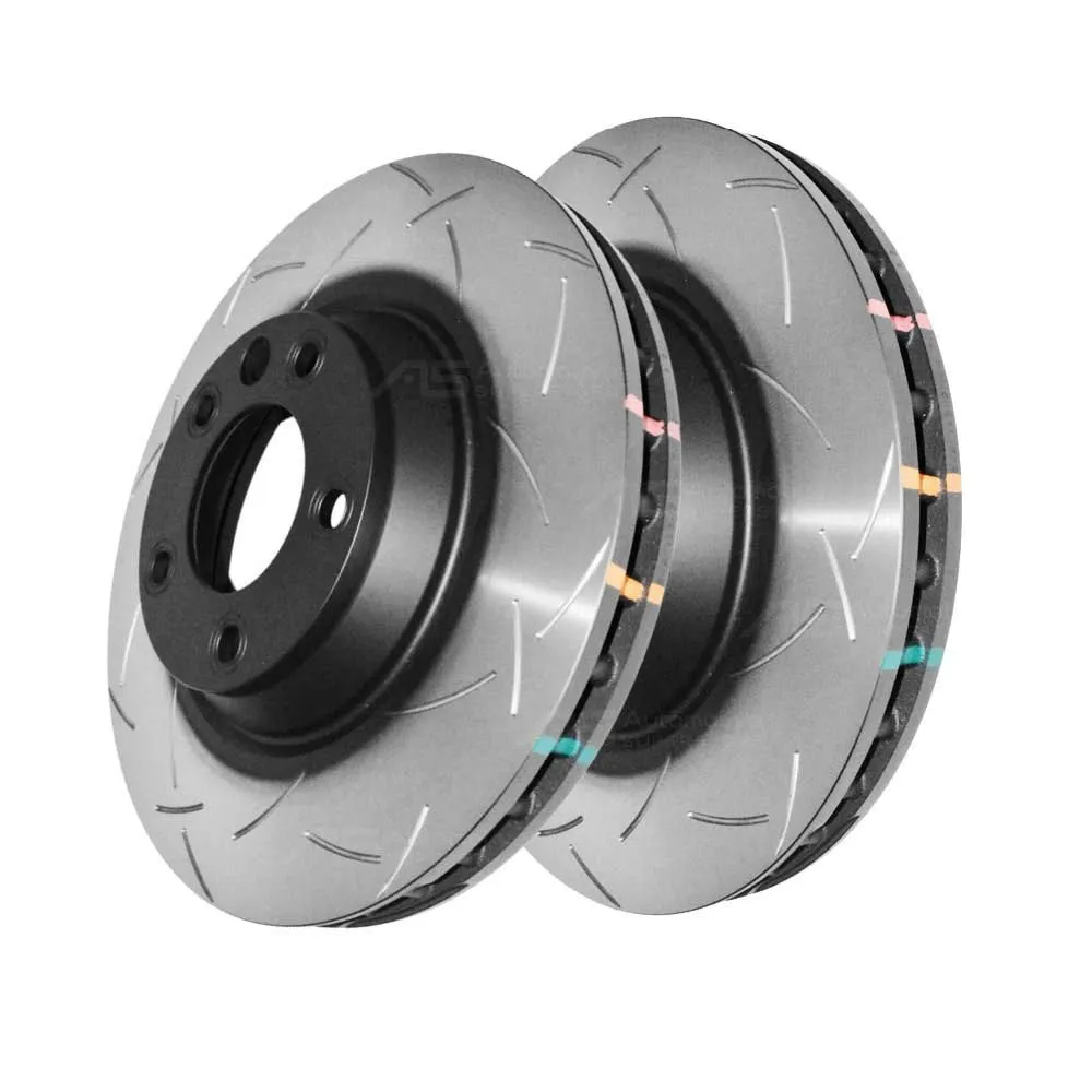 DBA's 4000 Series and 5000 Series rotors can be further enhanced with optional slots known as T3 - 48 CNC machined tri-directional curved slots. Machined slots in the friction surface allow a channel for braking by-products - brake dust and gasses from the incredible heat - to escape. This has a multitude of benefits, from reducing pad contamination, controlling heat build-up, and brake pad knock back. These combine to enhance braking performance and increase service life of the pads and rotors. Compared to more common straight slots, the unique curved slot design reduces the noise associated with 'racing' brakes, and minimises any detriment to pad surface condition.