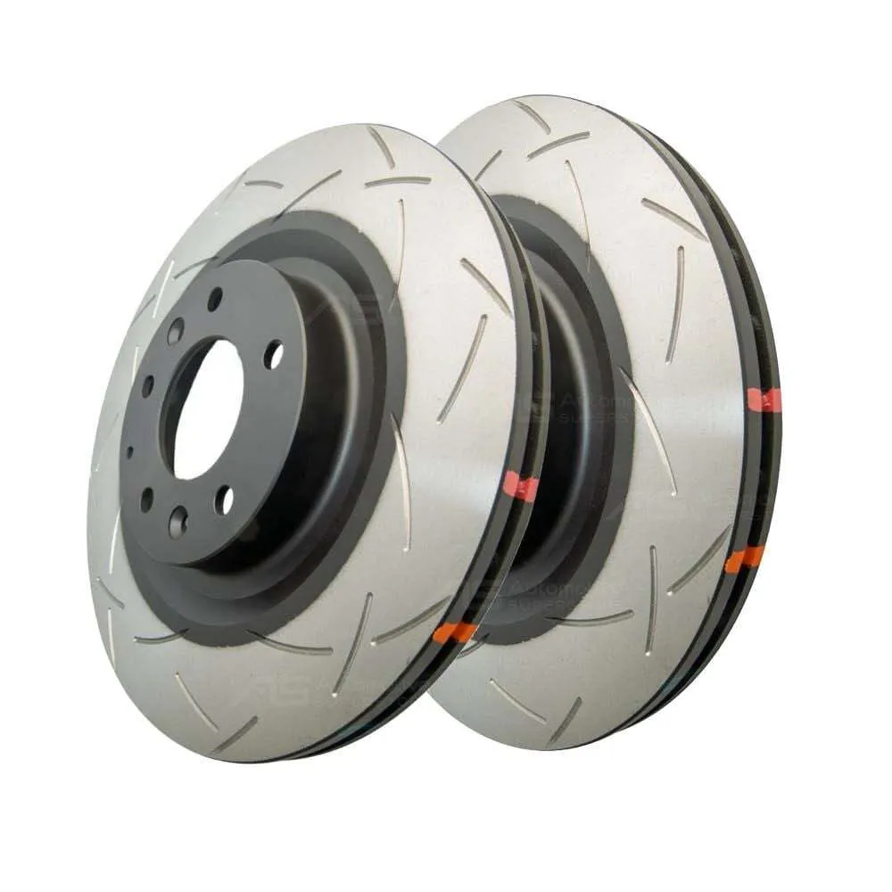 DBA's 4000 Series and 5000 Series rotors can be further enhanced with optional slots known as T3 - 48 CNC machined tri-directional curved slots. Machined slots in the friction surface allow a channel for braking by-products - brake dust and gasses from the incredible heat - to escape. This has a multitude of benefits, from reducing pad contamination, controlling heat build-up, and brake pad knock back. These combine to enhance braking performance and increase service life of the pads and rotors. Compared to more common straight slots, the unique curved slot design reduces the noise associated with 'racing' brakes, and minimises any detriment to pad surface condition.
