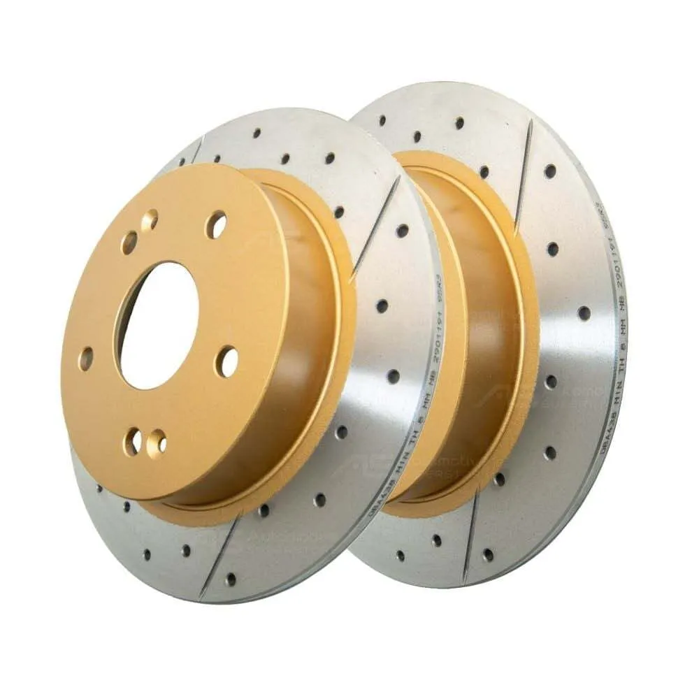 DBA rotors can be improved with the X-Gold design, a unique non-directional cross-drilled pattern that increases passive cooling, allows for gas-escape whilst maintaining excellent rigidity. The performance realised is similar to the T2 slotted range, however the aesthetics are further enhanced with all of the non-friction surfaces being coated in a unique gold paint.