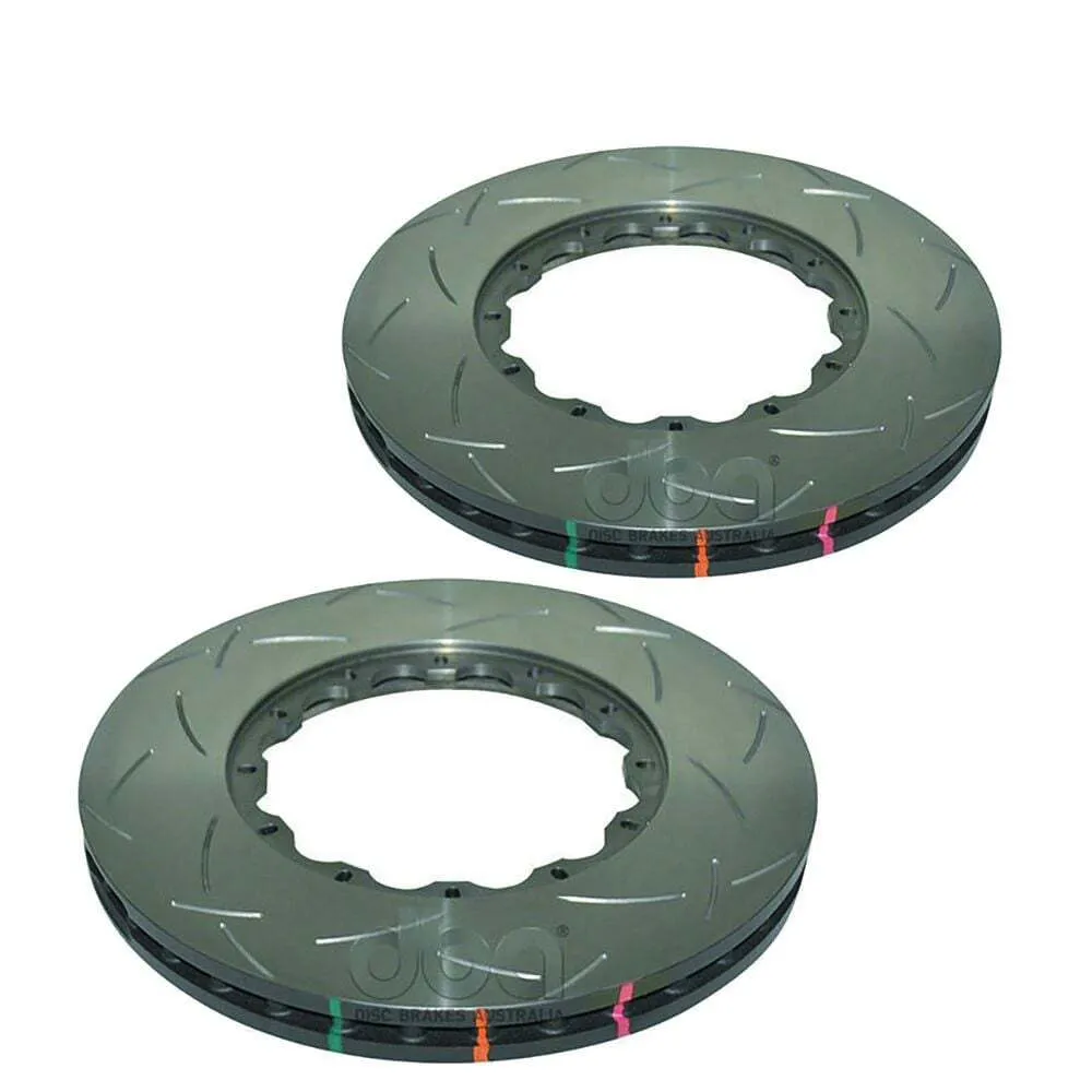 DBA's 4000 Series and 5000 Series rotors can be further enhanced with optional slots known as T3 - 48 CNC machined tri-directional curved slots. Machined slots in the friction surface allow a channel for braking by-products - brake dust and gasses from the incredible heat - to escape. This has a multitude of benefits, from reducing pad contamination, controlling heat build-up, and brake pad knock back. These combine to enhance braking performance and increase service life of the pads and rotors. Compared to more common straight slots, the unique curved slot design reduces the noise associated with 'racing' brakes, and minimises any detriment to pad surface condition.