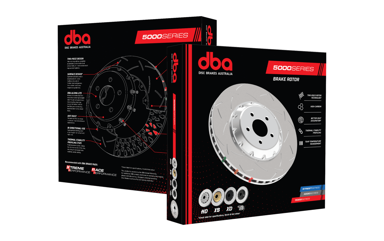 The 5000 Series take the same excellent XG-150 cast iron alloy used in the Street Series, and are further enhanced with TSP - Thermal Stability Profiling. This additional heat treatment process takes detail down to the atomic level, aligning the grain structure the compound to produce a uniform material. This is then combined with an aerospace grade T6061-T6 aluminium alloy centre hat, bolted together with NAS specification hardware. The move to an aluminium centre hat reduces sprung weight and prevents heat transfer from the rotor to the hub, realising greater performance and reducing thermal impact on the wheel bearings and hub. The result of this is the 5000 Series HD, a superior quality rotor able to withstand greater levels of heat, for a longer service life considerable resistance to warping from excessive heat events. Standard on every 5000 Series rotor is the inclusion of Thermographic Heat Paint Markings, allowing the user to identify peak braking temperatures in extreme conditions. 5000 Series rotors are recommended for high performance track cars, heavily laden ute's and 4WD's, and for towing large trailers or caravans.