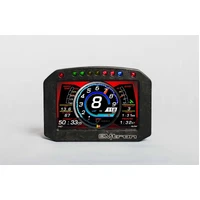 ED-7 Carbon Digital Dash Displays feature a full-colour, daylight readable screen surrounded by a tough, lightweight flow-molded carbon fiber composite housing. Seven ultra-bright LEDs span the top of the display housing for RPM and shift light indication. Users can program them to ascend in specific increments based on RPM range and flash when it is time to shift. Brightness is user programmable on the fixed colour LEDs. A remote button can be wired into the rear connector, allowing the user to scroll between screens . Two additional programmable LEDs are located above the toggle buttons on the top of the housing on either side of the integrated LED shift lights.