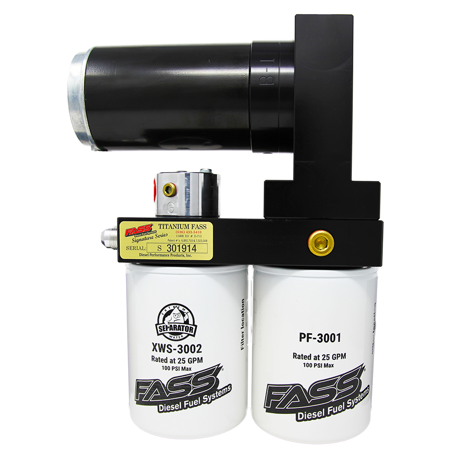 A Titanium Signature Series fuel System also offers advanced filtration benefits that will help protect your 12 valve's injection Systems, effectively extending the life of both your P-System and Bosch Diesel Injectors. These Benefits include an improved filtration rating of 2 Microns, a built-in water separation filter, and FASS Diesel Fuel Systems patented air/vapor removal process.