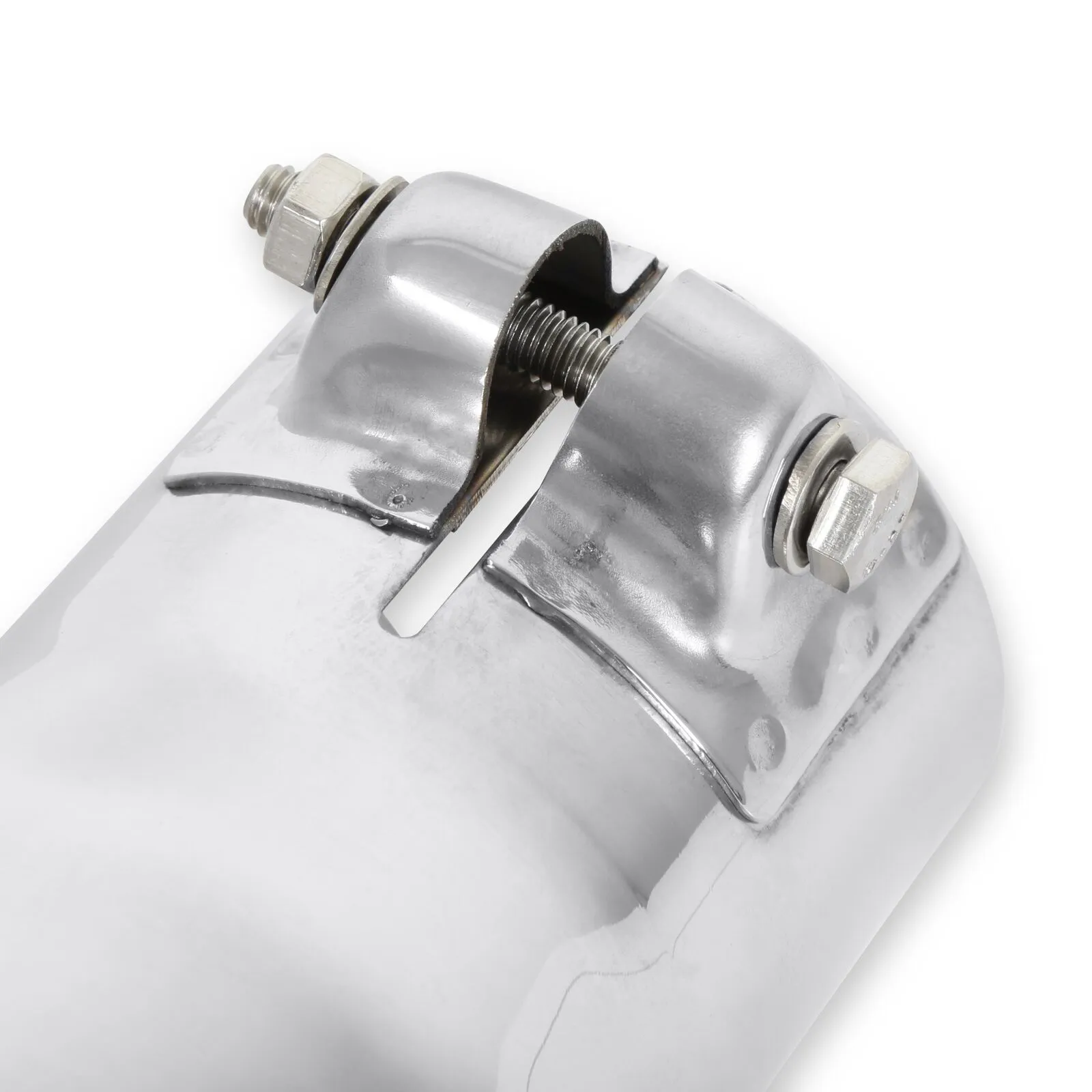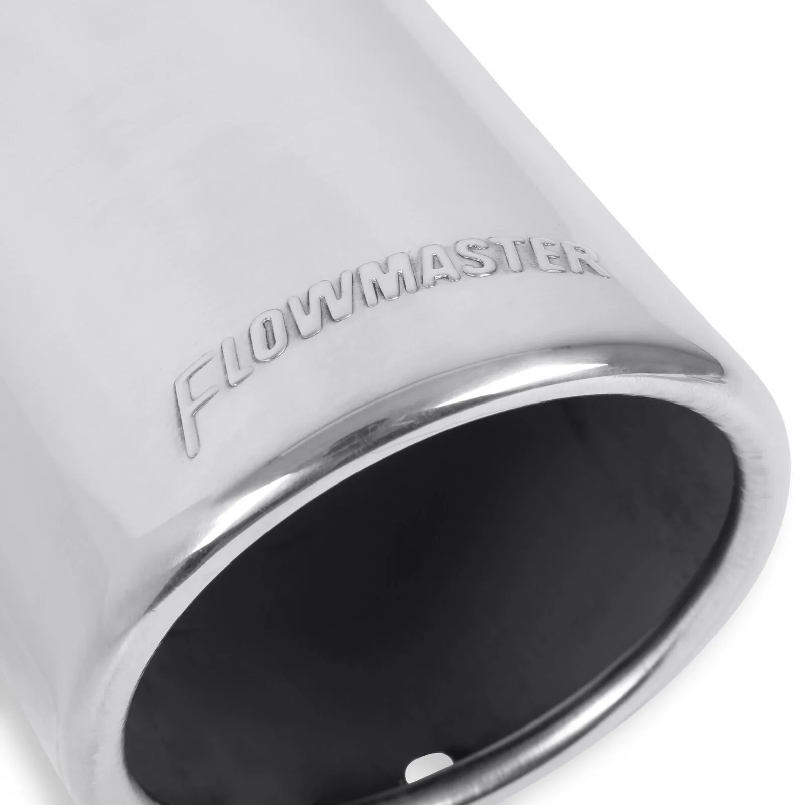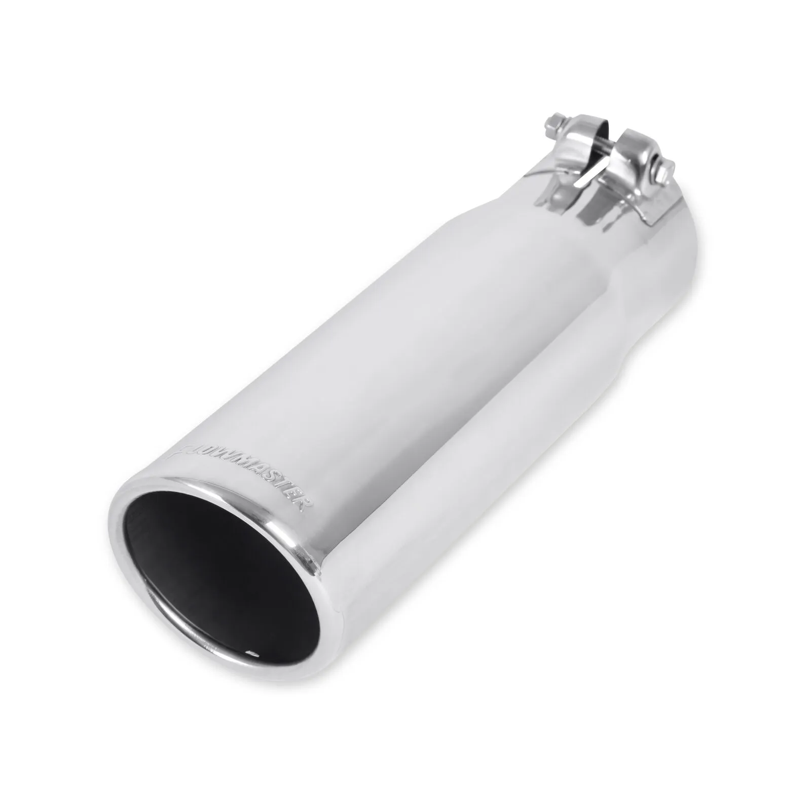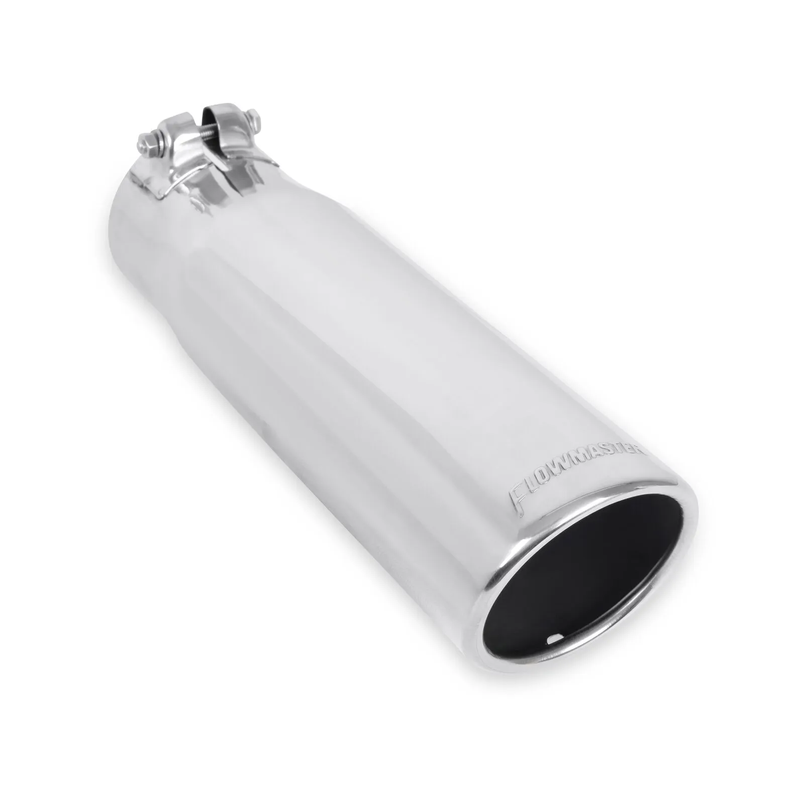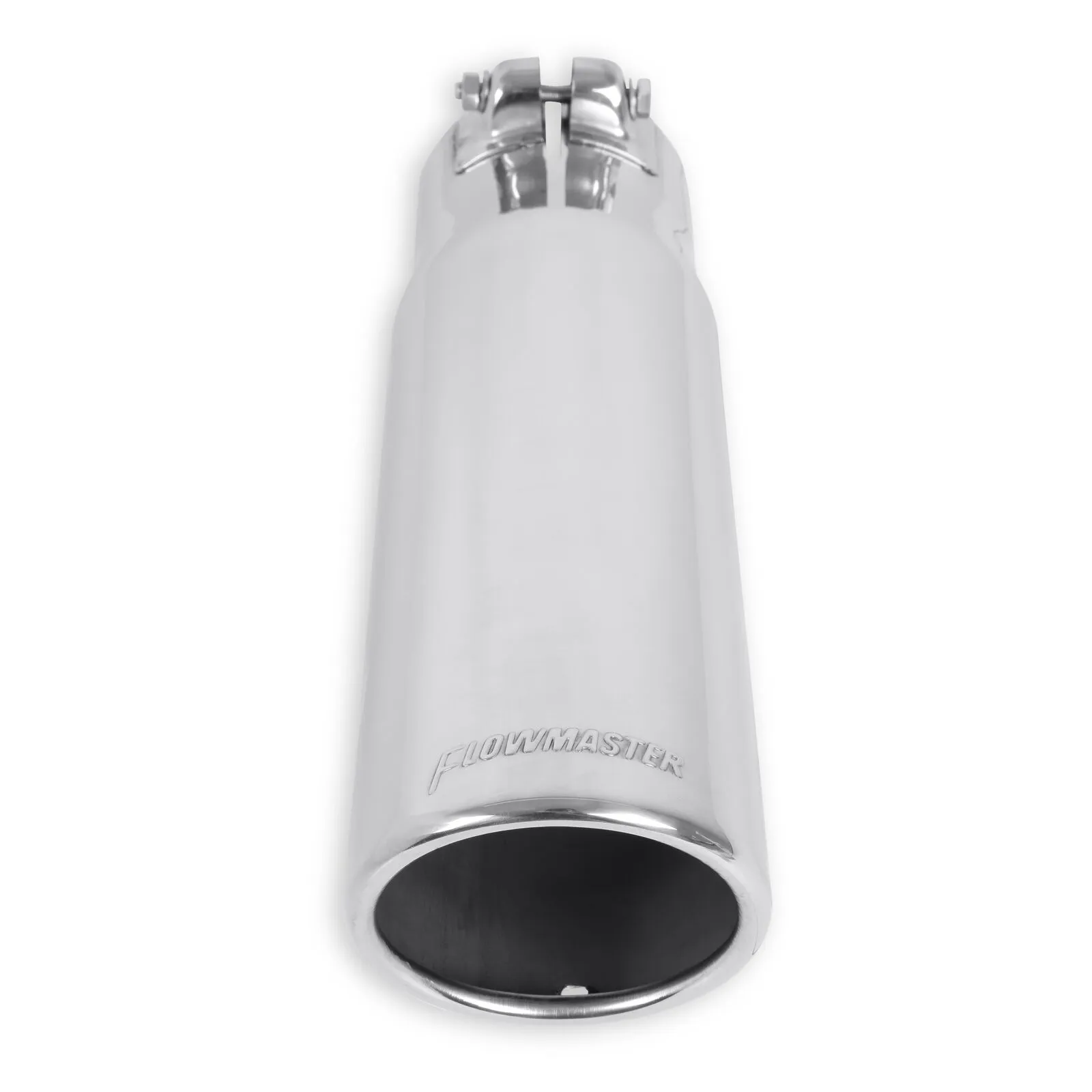 Exhaust tip, logo embossed polished stainless, rolled edge angle cut, 3.50 in. tip diameter x 3.00 in. pipe diameter x 12.00 in. length, clamp on. Sold individually.