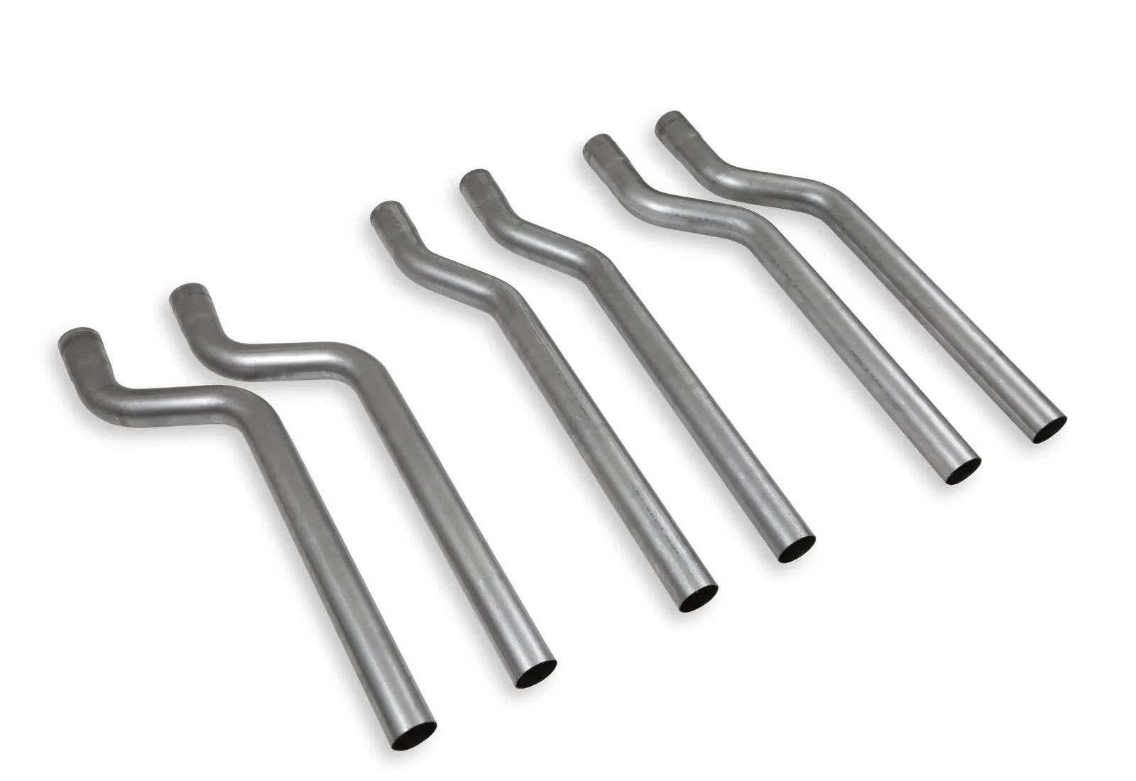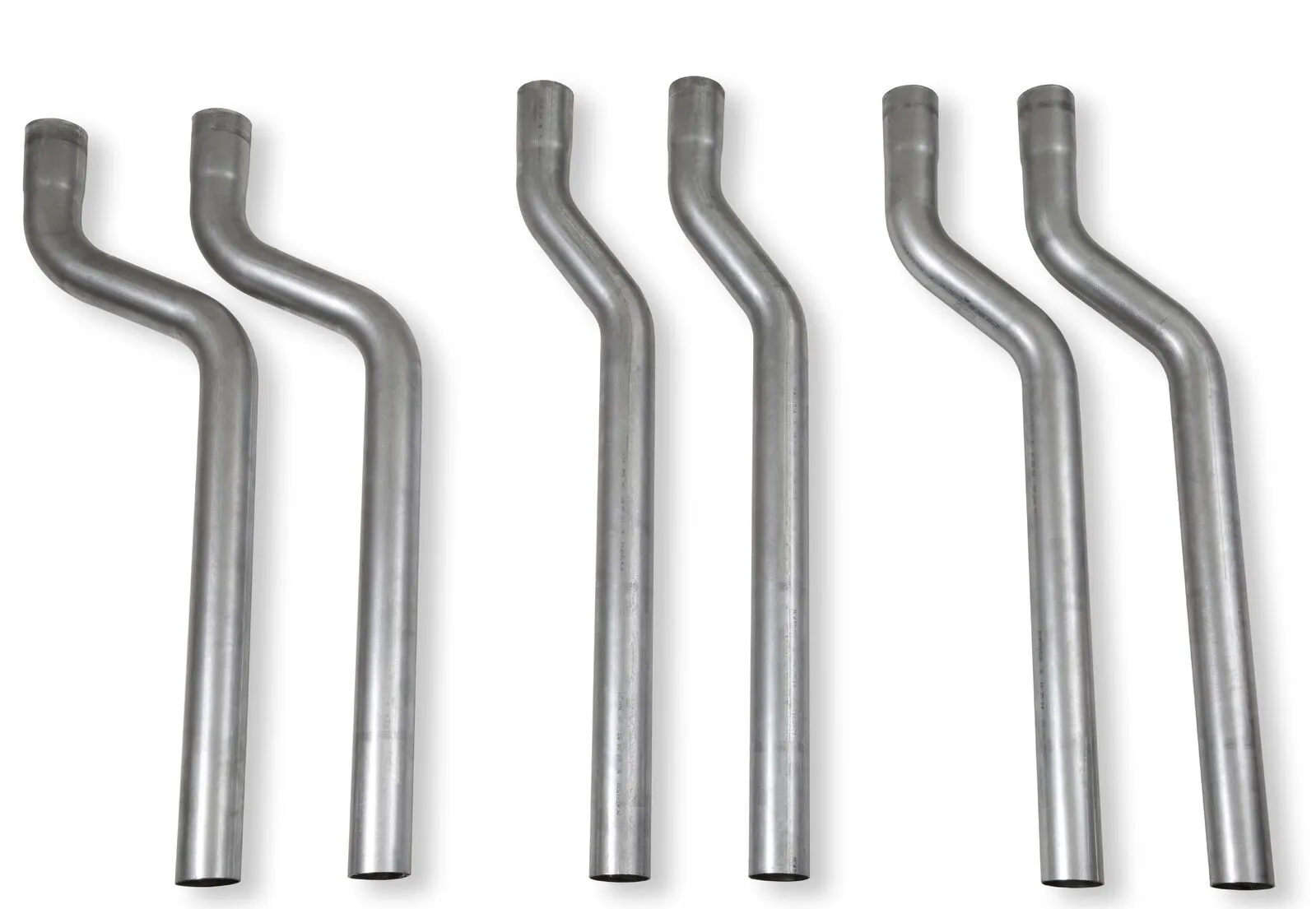 Mandrel bent S-shape pipes developed to simplify the routing and fabrication of exhaust pipes from headers to muffler. Deep slip fit on single end of pipe(s). Available in various sizes.