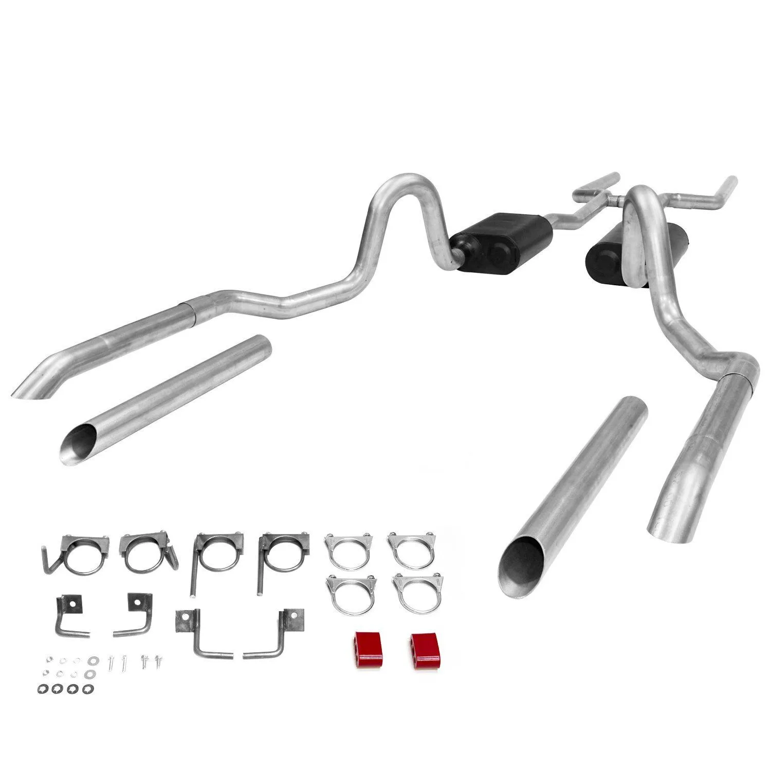 Submit A RequestThis American Thunder® Crossmember-Back exhaust system is custom designed for most 1964-1972 GM A-body cars and is for the person looking for a complete 2.50-inch dual exhaust system with a moderately aggressive exterior tone and a moderate interior sound. With easy fit in mind, these aluminized steel systems feature all mandrel-bent tubing, an H-pipe to equalize the exhaust pressures for maximum performance and deep sound and includes a pair of specially selected Super 40 mufflers. The mandrel-bent 2.50-inch tailpipes tuck up out of the way for maximum clearance and offer you two choices of tailpipe exit styles. Like all Flowmaster® systems, benefits include improved throttle response, power, and mileage. Designed for an easy fit, these systems include all necessary parts and hardware for an easy installation and is covered by our 3-year Limited Warranty.