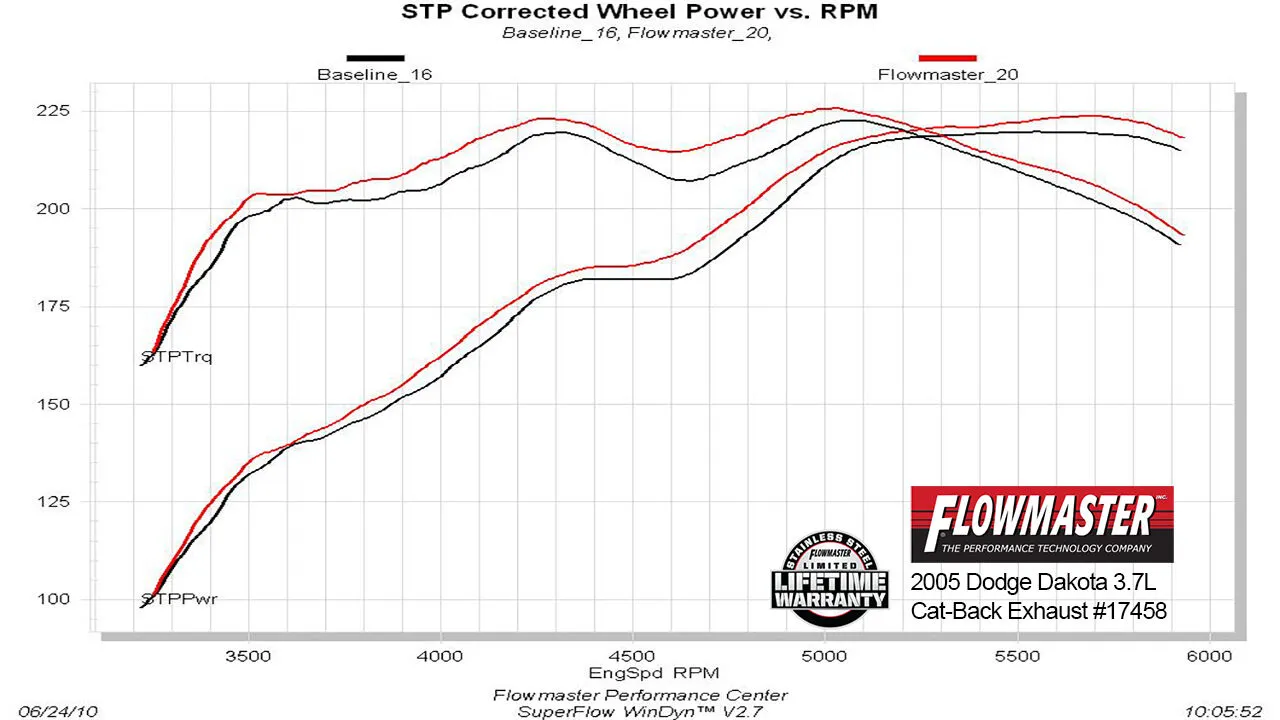 This Flowmaster Force II® cat-back exhaust system is custom designed for 2005-2010 Dodge Dakota trucks with V6 or V8 engines and is perfect for the person looking for a moderate sound level inside and outside of the truck, with all of the performance benefits that you would expect from Flowmaster®. This bolt-on emissions-legal system features a mandrel-bent aluminized steel inlet pipe flowing into a Super 50™ Series muffler for a moderate performance exterior sound. The single 3.00-inch aluminized steel mandrel-bent tailpipe is finished off with a large 3.50-inch polished embossed stainless steel tip. The exhaust system is covered by our 3-year Limited Warranty and includes all necessary parts, hardware and instructions for a quick and easy installation you can do at home. Note: Fits 2/4 wheel drive models and all wheelbases.