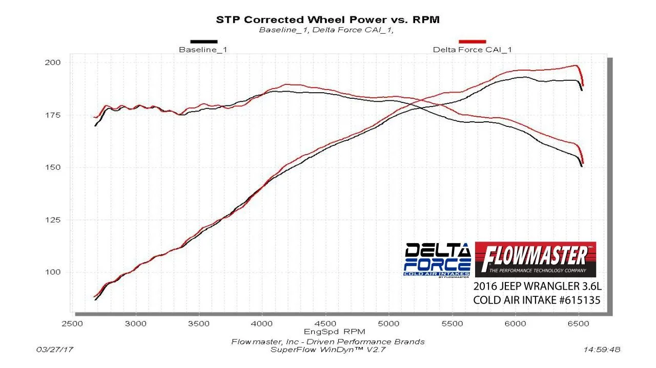 Take the performance of your vehicle to the next level with the addition of Flowmaster's new Delta Force Performance Air Intake system for 2012-2018 Jeep Wrangler (2 & 4 doors) with 3.6L engine. The Delta Force system contains an ultra-trick looking, custom molded black Cross-Linked Polyethylene (XLPE) high-flow intake tube, black anodized aluminum fittings (when applicable), high quality reinforced silicone couplers and all stainless steel hardware. Other features include a large diameter high-flow conical shaped 8 layer cotton gauze air filter, which traps more dirt than typical 6 layer designs, a custom-fit black powder-coated air dam with attachment brackets to securely mount the system in place along with soft bumpers to eliminate any metal to metal contact under the hood. The Delta Force Air Filters are serviceable with our new Delta Force cleaning kits which will help outlast your vehicle. For maximum performance and that iconic Flowmaster exhaust tone, we highly recommend pairing your new Delta Force Performance Air Intake with a Flowmaster exhaust system. This kit is CARB compliant under EO# D-698-10.