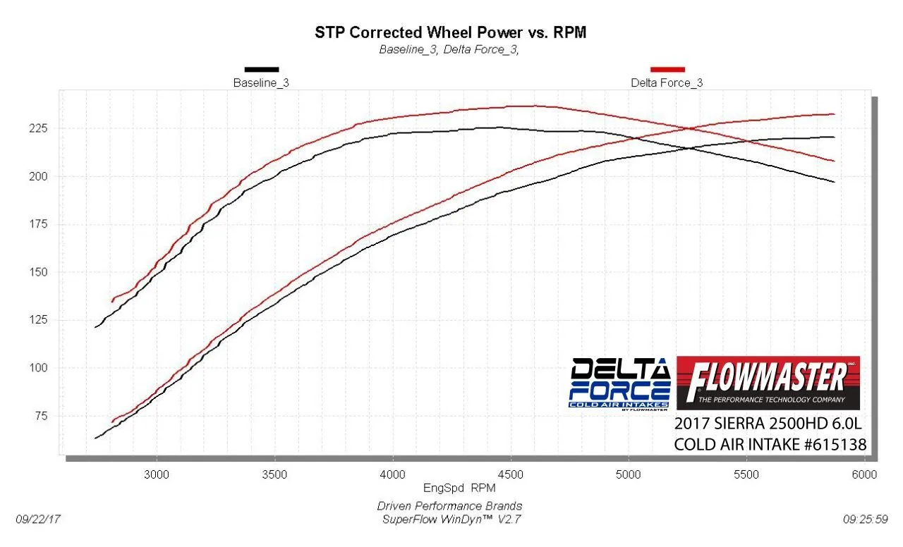 Take the performance of your vehicle to the next level with the addition of Flowmaster's new Delta Force Performance Air Intake system for 2016-2018 GM 2500HD Silverado/Sierra with 6.0L engine. The Delta Force system contains an ultra-trick looking, custom molded black Cross-Linked Polyethylene (XLPE) high-flow intake tube, black anodized aluminum fittings (when applicable), high quality reinforced silicone couplers and all stainless steel hardware. Other features include a large diameter high-flow conical shaped 8 layer cotton gauze air filter, which traps more dirt than typical 6 layer designs, a custom-fit black powder-coated air dam with attachment brackets to securely mount the system in place along with soft bumpers to eliminate any metal to metal contact under the hood. The Delta Force Air Filters are serviceable with our new Delta Force cleaning kits which will help outlast your vehicle. For maximum performance and that iconic Flowmaster exhaust tone, we highly recommend pairing your new Delta Force Performance Air Intake with a Flowmaster exhaust system.