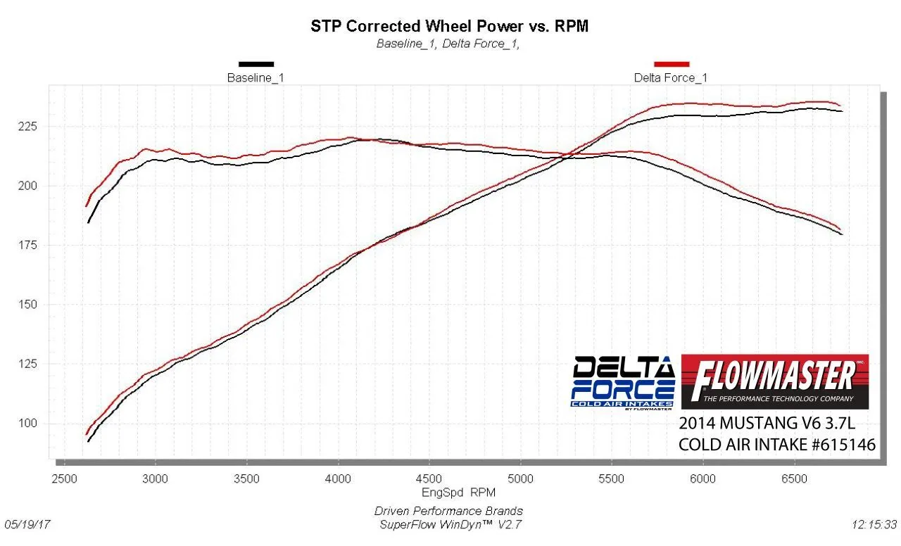 Take the performance of your vehicle to the next level with the addition of Flowmaster's new Delta Force Performance Air Intake system for 2011-2014 Ford Mustang with 3.7L engine. The Delta Force system contains an ultra-trick looking, custom molded black Cross-Linked Polyethylene (XLPE) high-flow intake tube, black anodized aluminum fittings (when applicable), high quality reinforced silicone couplers and all stainless steel hardware. Other features include a large diameter high-flow conical shaped 8 layer cotton gauze air filter, which traps more dirt than typical 6 layer designs, a custom-fit black powder-coated air dam with attachment brackets to securely mount the system in place along with soft bumpers to eliminate any metal to metal contact under the hood. The Delta Force Air Filters are serviceable with our new Delta Force cleaning kits which will help outlast your vehicle. For maximum performance and that iconic Flowmaster exhaust tone, we highly recommend pairing your new Delta Force Performance Air Intake with a Flowmaster exhaust system.