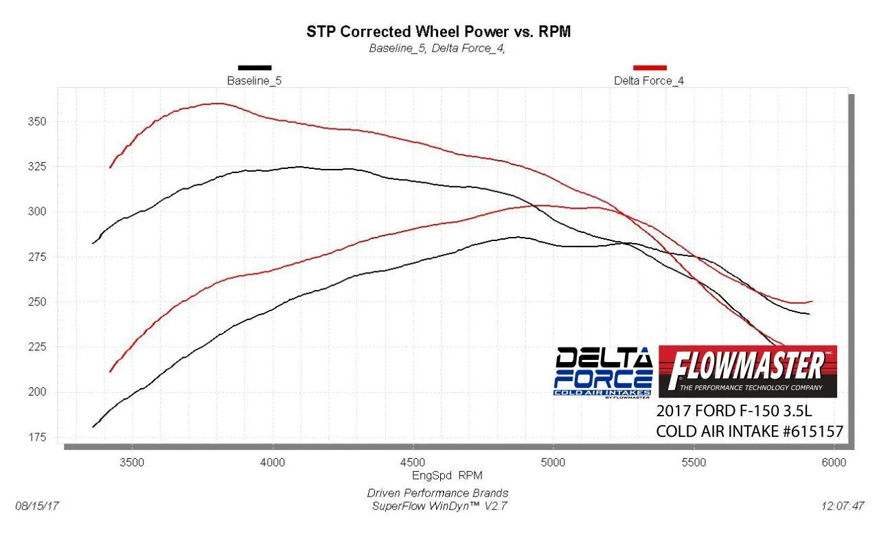 Take the performance of your vehicle to the next level with the addition of Flowmaster's new Delta Force Performance Air Intake system for 2017-2018 Ford F-150 truck with 3.5L Ecoboost engine. The Delta Force system contains an ultra-trick looking, custom molded black Cross-Linked Polyethylene (XLPE) high-flow intake tube, black anodized aluminum fittings (when applicable), high quality reinforced silicone couplers and all stainless steel hardware. Other features include a large diameter high-flow conical shaped 8 layer cotton gauze air filter, which traps more dirt than typical 6 layer designs, a custom-fit black powder-coated air dam with attachment brackets to securely mount the system in place along with soft bumpers to eliminate any metal to metal contact under the hood. The Delta Force Air Filters are serviceable with our new Delta Force cleaning kits which will help outlast your vehicle. For maximum performance and that iconic Flowmaster exhaust tone, we highly recommend pairing your new Delta Force Performance Air Intake with a Flowmaster exhaust system. This kit has been granted CARB EO # D-698-7 and is 50-state legal for use on listed applications.