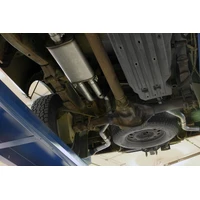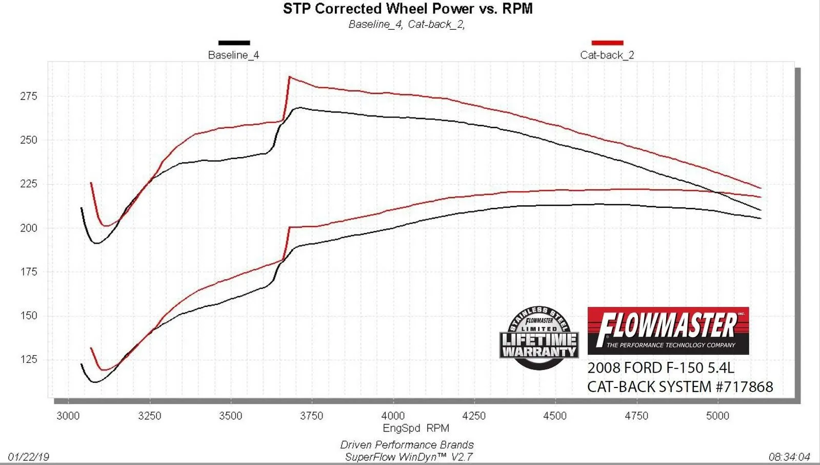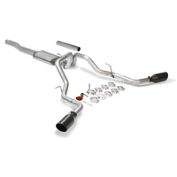 The Flowmaster® Flow FX Cat-back exhaust system is designed for 2004-2008 Ford F-150 trucks with 4.6L and 5.4L engines. This bolt-on system is manufactured using durable 409 stainless steel throughout, and features a 3.00-inch inlet pipe leading to a single inlet/dual outlet Flow FX® straight-through muffler for a deep, moderately aggressive sound and maximum performance. The dual 2.50-inch mandrel-bent tailpipes are custom routed to clear the factory spare tire and tow hitch without any clearance issues and exit out the sides behind the rear tires, which is ideal when towing so you don't blow exhaust fumes on your boat, vehicle or trailer. The system is then finished off with a pair of large 4.50-inch black ceramic coated stainless steel tips, giving your F-150 an aggressive look to go with the sound of the Flow FX performance muffler. This system utilizes the factory hanger locations and includes detailed instructions and all necessary hardware for an easy at home installation. Notes: Fits all 2/4 wheel drive models and all wheelbases.
