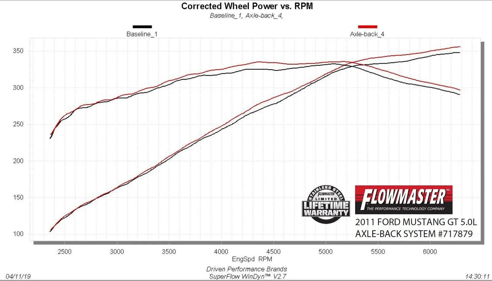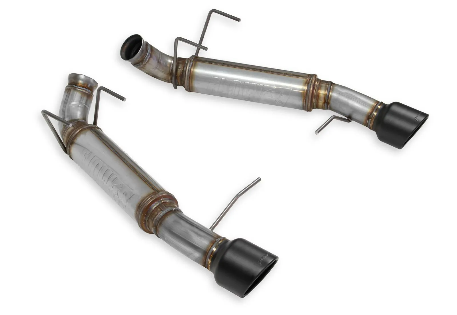 Introducing our new Flow FX® Axle-back exhaust system for 2011-2012 Ford Mustang GT coupes and convertibles with the 5.0L engine. Features include 3.00-inch mandrel-bent stainless steel tubing running into a pair of compact round Flow FX "straight-through" mufflers for a deep and powerful tone. The large 3.00-inch core mufflers ensure maximum performance, are constructed from bright 409S stainless steel and utilize the factory hanger locations for a quick and easy installation. The system is finished off with large 4.50-inch black ceramic coated stainless steel tips filling out the factory exhaust cutouts. Includes all necessary parts, hardware, and detailed instructions. Notes: Also fits 2012 Mustang Boss 302 model.