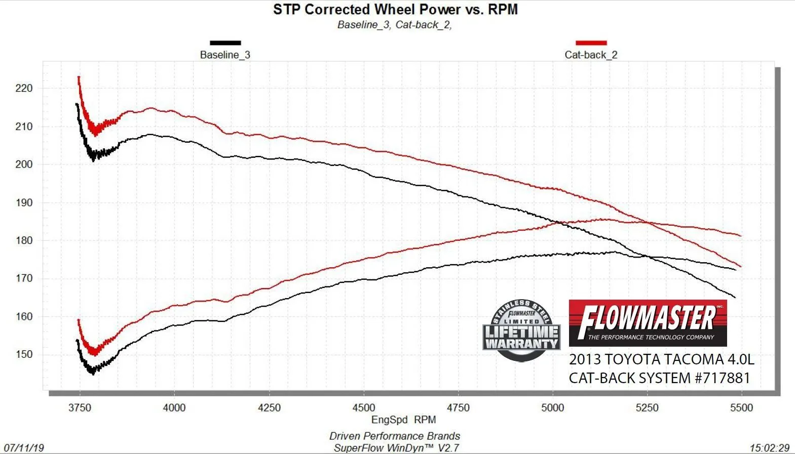 Introducing the new Flow FX ® Cat-back exhaust system for 2005-2015 Toyota Tacoma with the 4.0L engine. This performance exhaust system fits both 2/4 wheel drive models and all wheelbases and is manufactured from bright 409S stainless steel for years of trouble-free service. Features include a 2.50-inch inlet pipe leading into the Flow FX "straight-through" muffler for great sound and maximum performance. The mandrel-bent tailpipe exits out behind the rear passenger side tire and is finished off with large 3.50-inch diameter black ceramic coated 304S stainless steel tip, giving your Tacoma that custom look that goes hand in hand with the deep performance sound of the Flowmaster® Flow FX muffler. The system uses all the factory hanger locations, includes all necessary hardware and instructions for an easy installation that you can do at home. Note: Fits both 2 & 4 wheel drives, and all wheelbases.