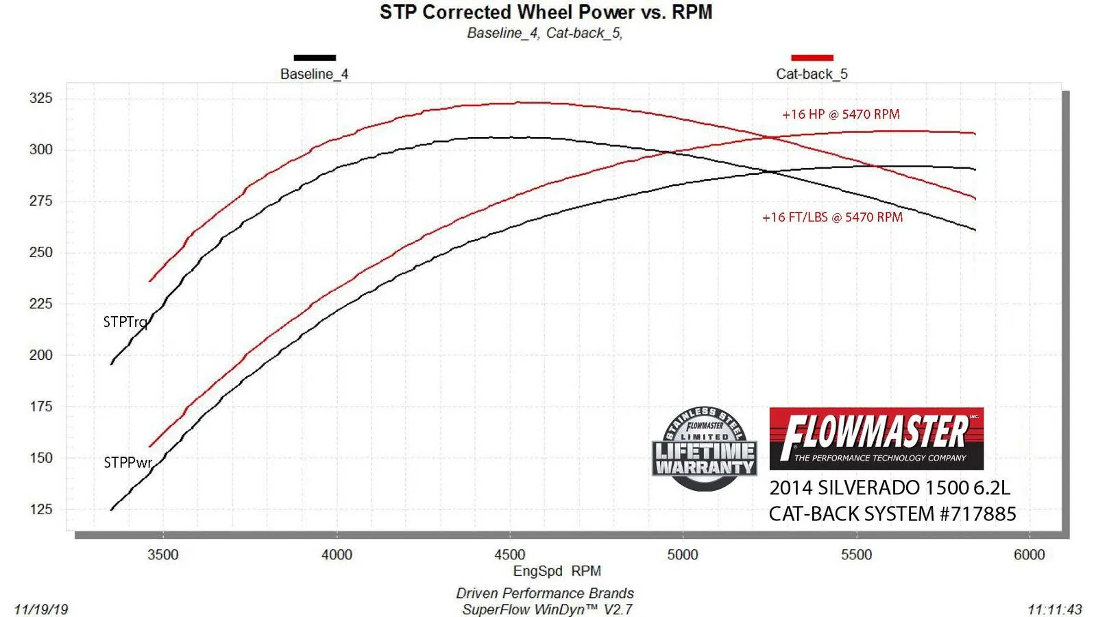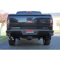 The new Flowmaster® Flow FX® cat-back exhaust system for the 2011-2018 GM Silverado/Sierra 1500 trucks with the 6.2-Liter engine is manufactured using durable 409 stainless steel throughout and features 3.5-inch mandrel bent pipes for better exhaust gas flow, and a Flow FX "straight-through" muffler is used for a moderate sound level and maximum performance. Maximum increases on the dyno revealed +16 hp and +16 lb-ft at the rear wheels. This system exits out the side, behind the rear wheel with a 5.00-inch black ceramic tip for added style and a custom look. The system uses all the existing factory hanger locations and includes installation instructions and all necessary hardware for an easy installation that you can do at home. Backed by Flowmaster's Lifetime Limited Warranty.