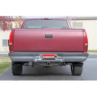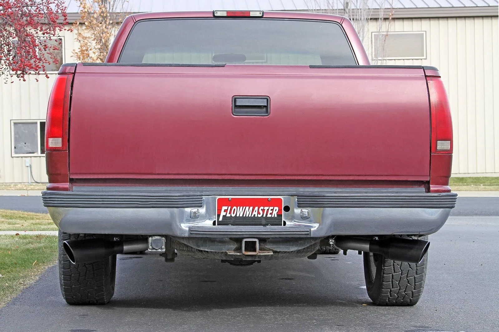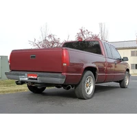This Flow FX cat-back exhaust system is designed for the 1996-1999 Chevrolet/GMC 1500 Extended Cab/Short Bed trucks with the 5.7L engine and dual catalytic converters. Features include 409 stainless steel construction for added durability and 16-gauge 3.0-inch to 2.5-inch mandrel-bent tubing for free unrestricted flow. The compact oval "straight-through" Flow FX performance muffler delivers a moderate yet deep and powerful sound while the interior sound is kept very mild. The system uses the factory hanger locations and is finished off with two 4.50-inch black ceramic-coated 304 stainless steel tips embossed with the Flowmaster name exiting on each side of the truck. The kit includes detailed instructions and all hardware necessary for a quick and easy installation you can do at home. Backed by Flowmaster's Lifetime Limited Warranty.