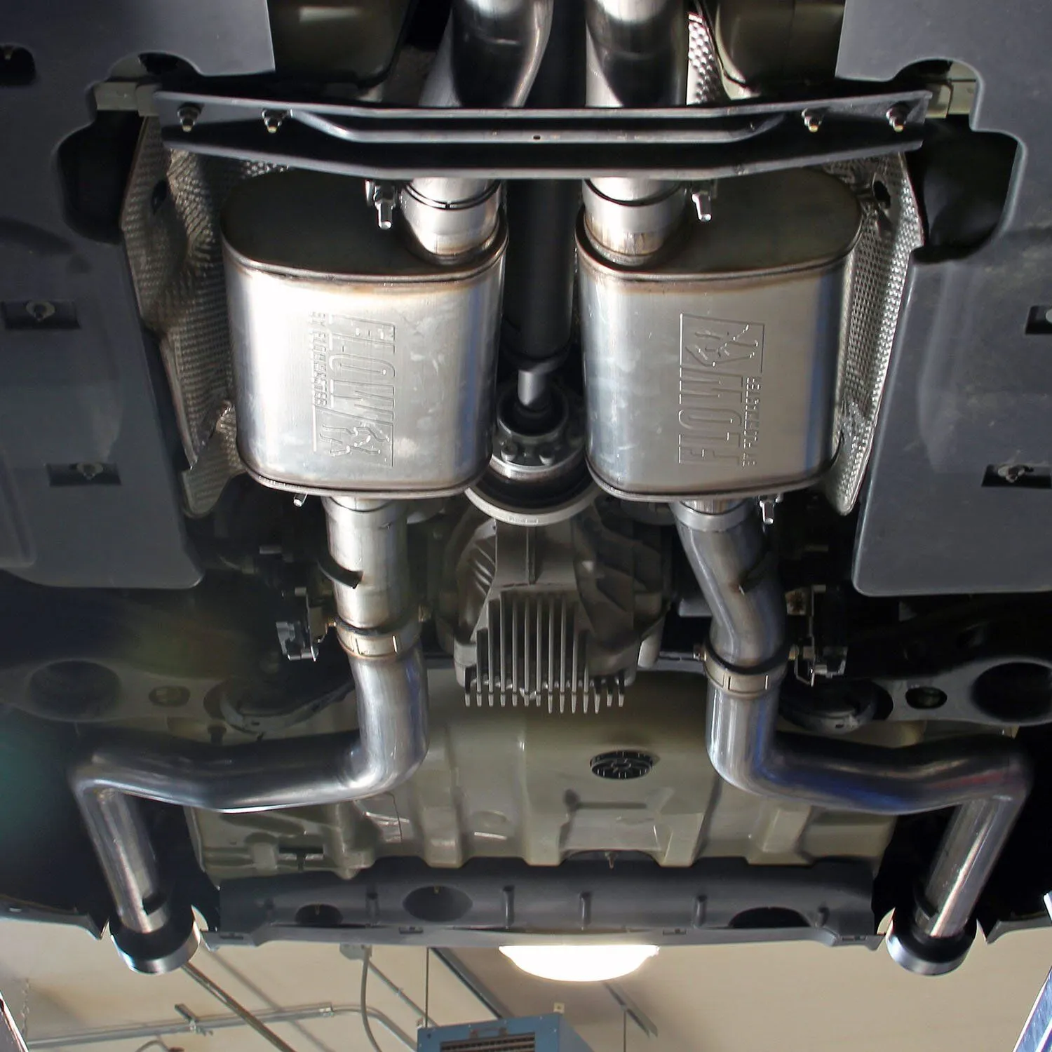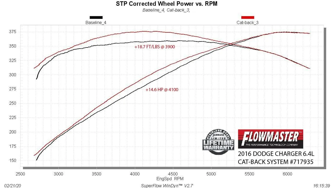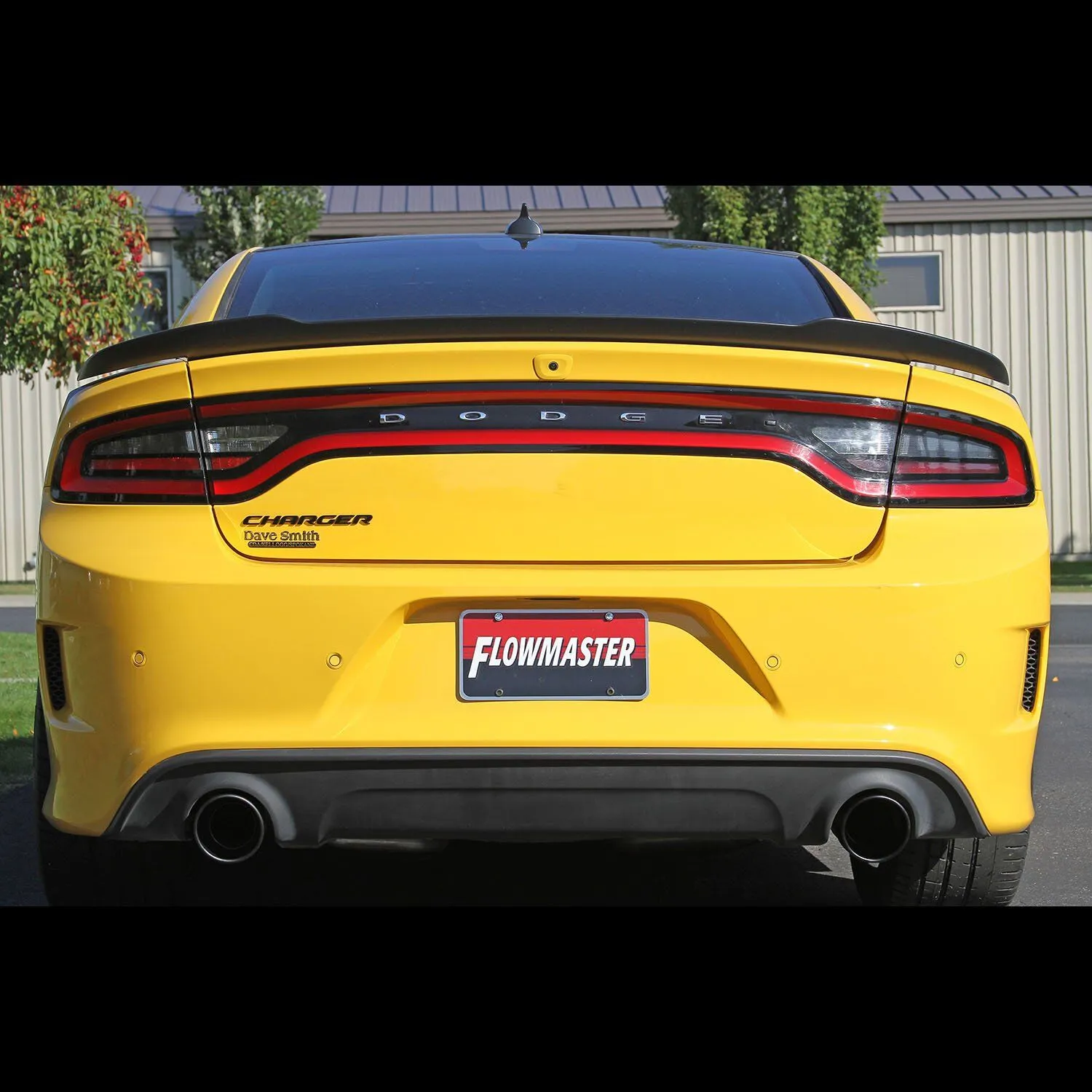 Introducing Flowmaster's new Flow FX® Cat-back exhaust system for the 2015-2023 Dodge Charger Hellcat and SRT cars with the 6.2L or 6.4L Hemi engine and Factory Active Exhaust Valves. This system is perfect for the person looking for a moderately aggressive exterior and interior sound level with all of the performance benefits that you would expect from Flowmaster®. Features include mandrel bent 3.00-inch stainless steel tubing into the Scavenger Series® X-pipe cross-over for maximum performance and tone, flowing into a pair our new Flow FX "straight-through" mufflers for a deep and powerful sound. The dual 3.00-inch mandrel-bent stainless steel tailpipes retain the Factory Active Exhaust Valves and the system is finished off with a pair of aggressive looking 4.50-inch black ceramic coated 304s stainless steel tips embossed with the Flowmaster name. The large tips exit within the rear bumper valance and gives your car the look that it should have come with from the factory. This system is designed to use the factory hanger locations, includes all necessary parts, hardware and detailed instructions for a relatively easy at home installation.