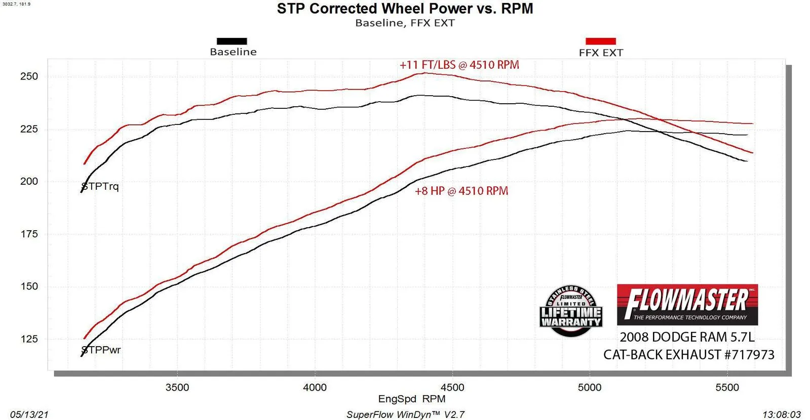 Flowmaster introduces our Flow FX Extreme stainless steel cat-back exhaust system for the 2006-2008 Dodge RAM 1500 trucks with the 5.7-liter engine. This system uses a Flow FX series muffler for an aggressive to moderate sound level and increased performance. 3.00-inch mandrel bent 409 stainless steel tubing allows for maximum exhaust flow and durability. The system has a turndown style, dump exit right after the muffler to eliminate the over-axle tailpipe. This elimination of the tailpipe helps improve ground clearance and departure angle when you are driving in more extreme off-road situations. On the dyno this system showed max gains of 8 hp and 11 lb-ft of torque at the rear wheels. All of the necessary hardware is included, and factory-mounting locations are used for an easy installation. Backed by Flowmaster's Lifetime Limited Warranty.