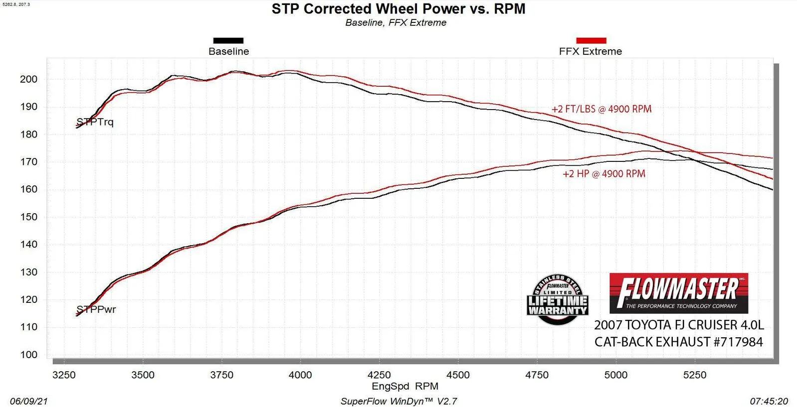 Flowmaster introduces our Flow FX Extreme stainless steel cat-back exhaust system for the 2007-2014 Toyota FJ Cruiser with the 4.0-liter engine. This system uses a Flow FX series muffler for an aggressive to moderate sound level and increased performance. 3.00-inch mandrel bent 409 stainless steel tubing allows for maximum exhaust flow and durability. The system has a turndown style, dump exit right after the muffler to eliminate the over-axle tailpipe. This elimination of the tailpipe helps improve ground clearance and departure angle when you are driving in more extreme off-road situations. All of the necessary hardware is included, and factory-mounting locations are used for an easy installation. Backed by Flowmaster's Lifetime Limited Warranty.