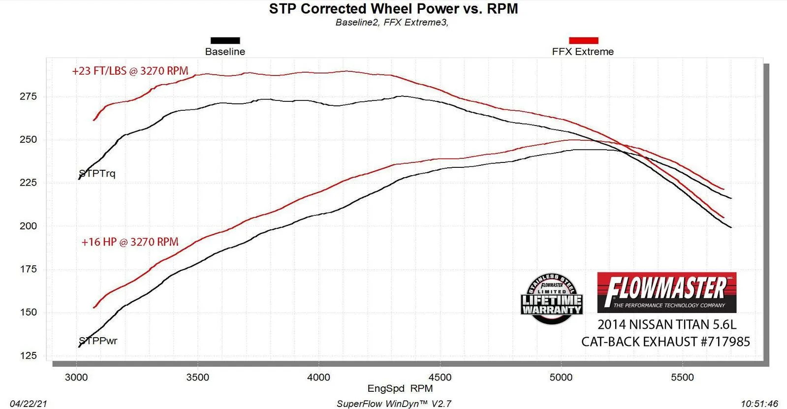 Flowmaster introduces our Flow FX Extreme stainless steel cat-back exhaust system for the 2004-2015 Nissan Titan with the 5.6-liter engine. This system uses a Flow FX series muffler for an aggressive to moderate sound level and increased performance. 3.00-inch mandrel bent 409 stainless steel tubing allows for maximum exhaust flow and durability. Dyno tests resulted in an extra 16 hp and 23 lb-ft of torque at the rear wheels over stock. The system has a turndown style, dump exit right after the muffler to eliminate the over-axle tailpipe. This elimination of the tailpipe helps improve ground clearance and departure angle when you are driving in more extreme off-road situations. All of the necessary hardware is included, and factory-mounting locations are used for an easy installation. Backed by Flowmaster's Lifetime Limited Warranty.