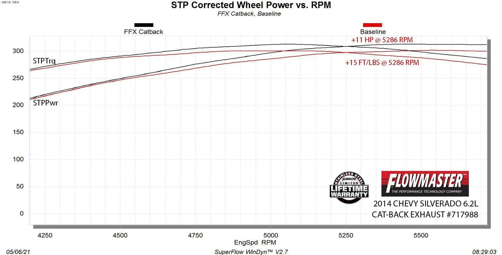 • Max increases of up to 11 hp and 15 lb-ft over the stock exhaust at the rear wheels