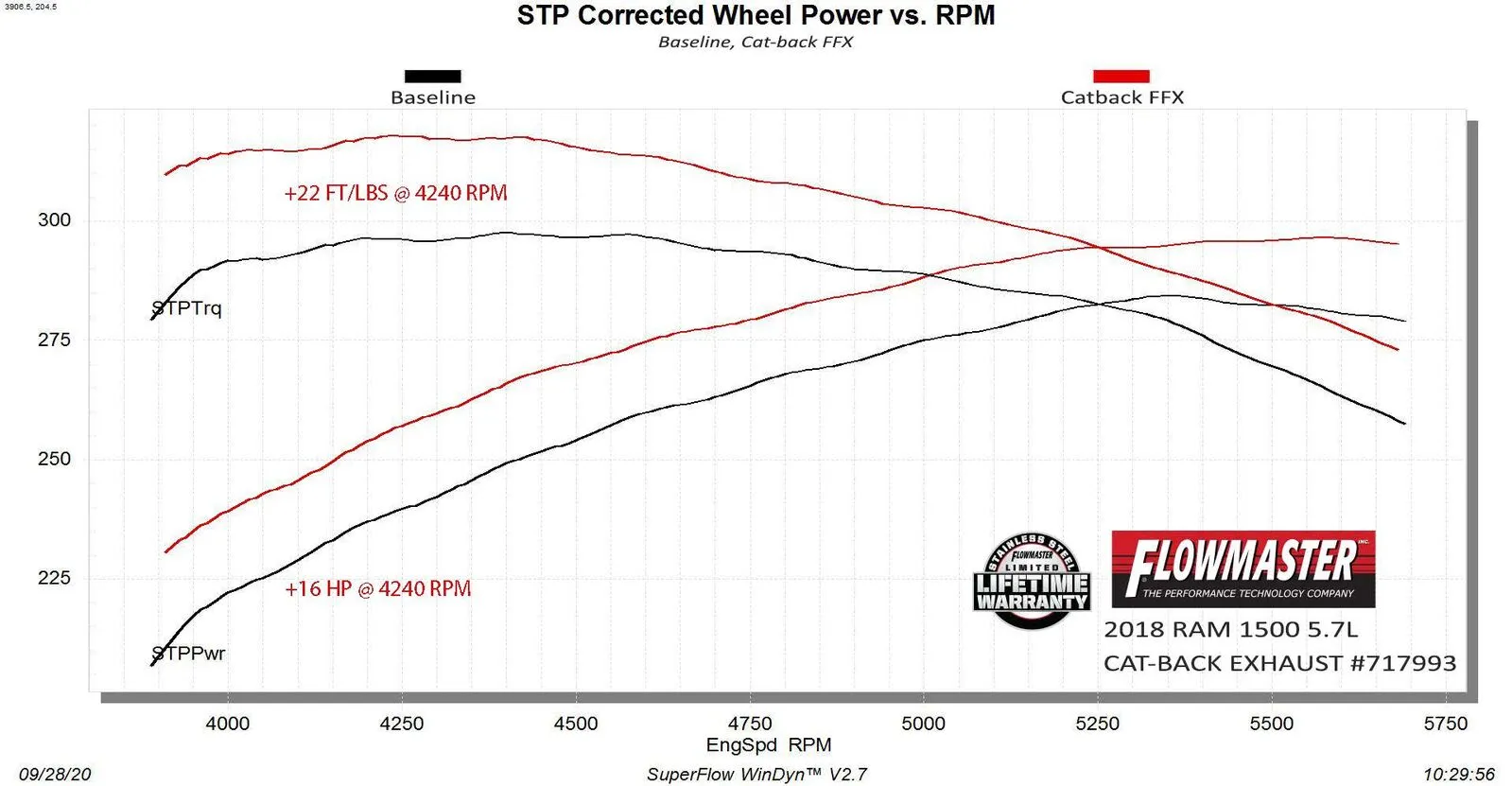 This Flowmaster® Flow FX® cat-back exhaust system for the 2009-2024 Dodge RAM 1500 trucks (19-24 1500 Classic only) with the 4.7 or 5.7-liter engine is manufactured using durable 409 stainless steel throughout and features 3.00 to dual 2.50-inch mandrel bent pipes for better exhaust gas flow. A Flow FX "straight-through" muffler is used for an aggressive to moderate sound level and maximum performance. Maximum increases on the dyno revealed +16 hp and +22 lb-ft at the rear wheels. This system exits out the same side, in front of the rear wheel on the passenger with dual 4.00-inch black ceramic tips for added style and a custom look. The system uses all the existing factory hanger locations and includes installation instructions and all necessary hardware for an easy installation that you can do at home. Backed by Flowmaster's Lifetime Limited Warranty.