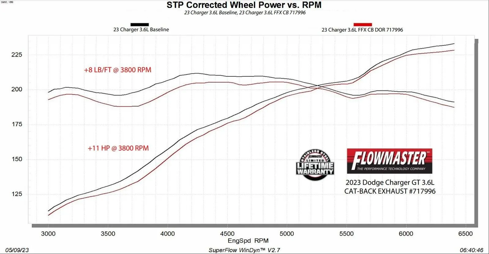 This Flowmaster® Flow FX® cat-back exhaust system for the 2018-2023 Dodge Charger GT / GT Plus and 2015-2023 Pursuit / Enforcer models with the 3.6-liter engine is manufactured using durable 409 stainless steel throughout and features 2.5-inch mandrel bent tubing for better exhaust gas flow. Dual Flow FX series mufflers are used for an aggressive to moderate exhaust note and increased performance. This system exits with dual 4.0-inch black ceramic coated stainless steel tips for added style and a custom look. Max gains of 11 hp and 8 lb.ft. of torque at the rear wheels over stock. The system uses all the existing factory hanger locations and includes installation instructions and all necessary hardware for an easy installation that you can do at home. Backed by Flowmaster's Lifetime Limited Warranty.