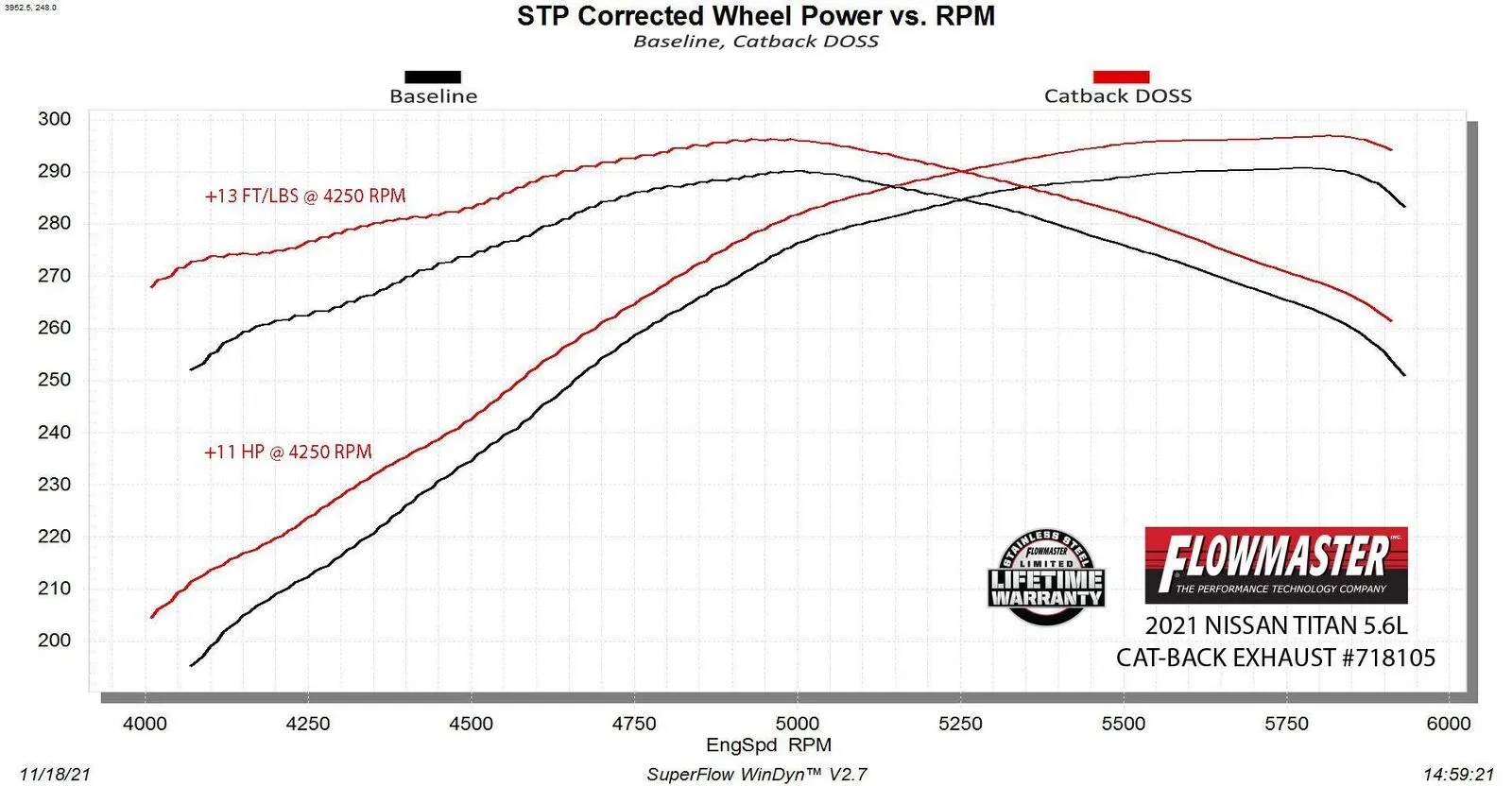 • Max increases of up to 11 hp and 13 lb-ft over the stock exhaust at the rear wheels