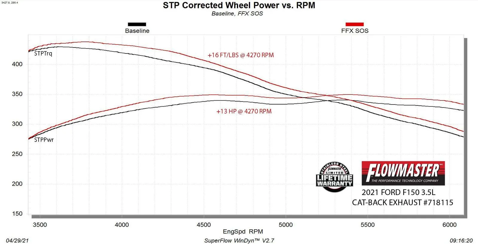 Flowmaster introduces our Flow FX stainless steel cat-back exhaust system for the 2021-2024 Ford F-150 trucks with the 2.7, 3.5, and 5.0-liter engines. This system uses a Flow FX series muffler for an aggressive to moderate sound level and increased performance. 3.00-inch mandrel bent 409 stainless steel tubing allows for maximum exhaust flow and durability. This system use a larger 4.50-inch black ceramic-coated tip for a custom look. Max dyno gains of 13 hp and 16 lb-ft at the rear wheels. All of the necessary hardware is included, and factory-mounting locations are used for an easy installation. Backed by Flowmaster's Lifetime Limited Warranty.