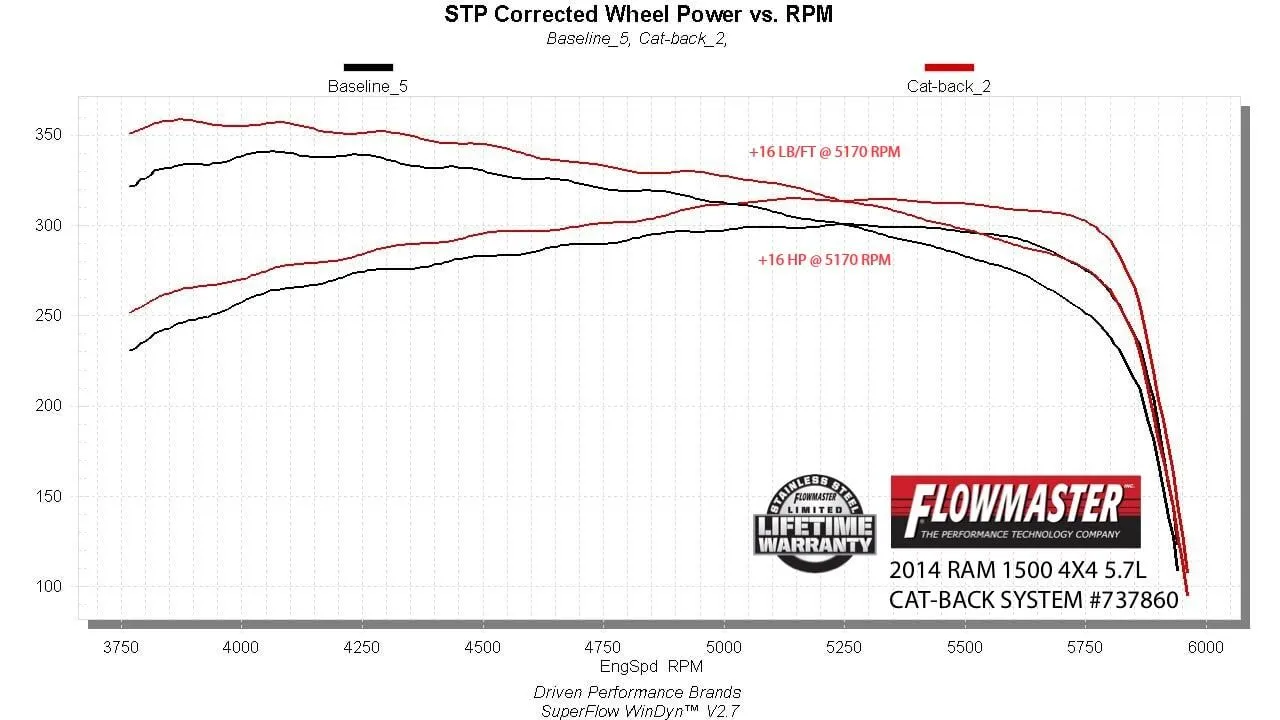 Flowmaster's® Signature Series Cat-back exhaust system fits 2009-2024* (*2019-2024 classic body only) RAM trucks with 5.7L Hemi and 2009-2013 4.7L models. It is manufactured using brushed 304 stainless steel for years of trouble-free service and highend good looks. This premium exhaust system is TIG welded for a stronger, more precise weld that looks as good as this system sounds. Features include a 3.00-inch inlet pipe leading into a single inlet/dual outlet TIG welded 304 stainless steel Signature Series straight-through muffler for great sound and maximum performance. The dual 2.50-inch mandrel bent tailpipes exit out the factory rear bumper cutouts with large 4.50-inch diameter PVD coated black chrome 304 stainless steel tips, giving your RAM a custom look that goes hand-in-hand with that deep, performance Signature Series sound. Max dyno gains of 16 hp and 16 lb-ft at the rear wheels. This Flowmaster Signature Series system utilizes all factory hanger locations and connections for an easy at home installation. Includes installation instructions and all necessary hardware. Note: This Flowmaster Signature Series Cat-back system fits both 2- and 4-wheel drive models and all cab and bed configurations.