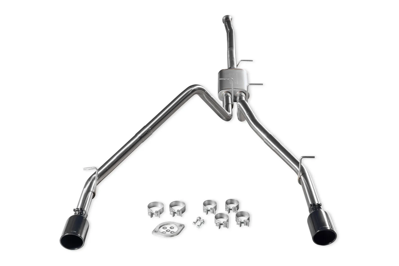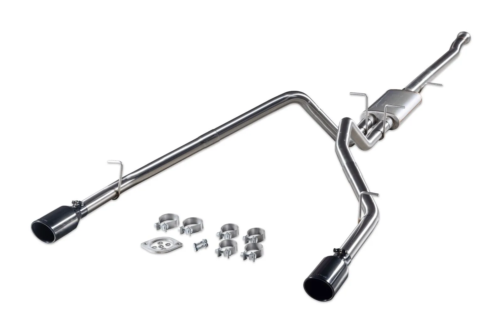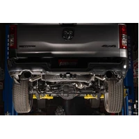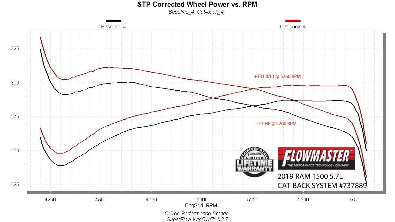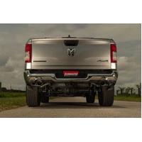 Flowmaster's® Signature Series Cat-back exhaust system is designed specifically for the 2019-2024 RAM truck (new body) with 5.7L Hemi and factory dual exhaust. Features include full brushed 304 stainless steel construction, large 3.00-inch flanged inlet pipe flowing in the single inlet/dual outlet Signature Series "straight-through" muffler for great sound and maximum performance. This premium exhaust system is TIG welded for a stronger, more precise weld that looks as good as this system sounds. The dual 2.50-inch mandrel bent tailpipes clear the factory hitch and spare tire and exit out through the factory rear bumper cutouts with large 4.50-inch diameter PVD coated black chrome 304S stainless steel tips giving your RAM that custom look that goes hand in hand with that deep performance Signature Series sound. Max dyno gains of 13 hp and 13 lb-ft at the rear wheels. The system uses all the factory hanger locations and connections for an easy installation that you can do at home. Includes installation instructions and all necessary hardware. Note: This system fits all wheelbases, both two and four wheel drive models along with all cab and bed configurations.